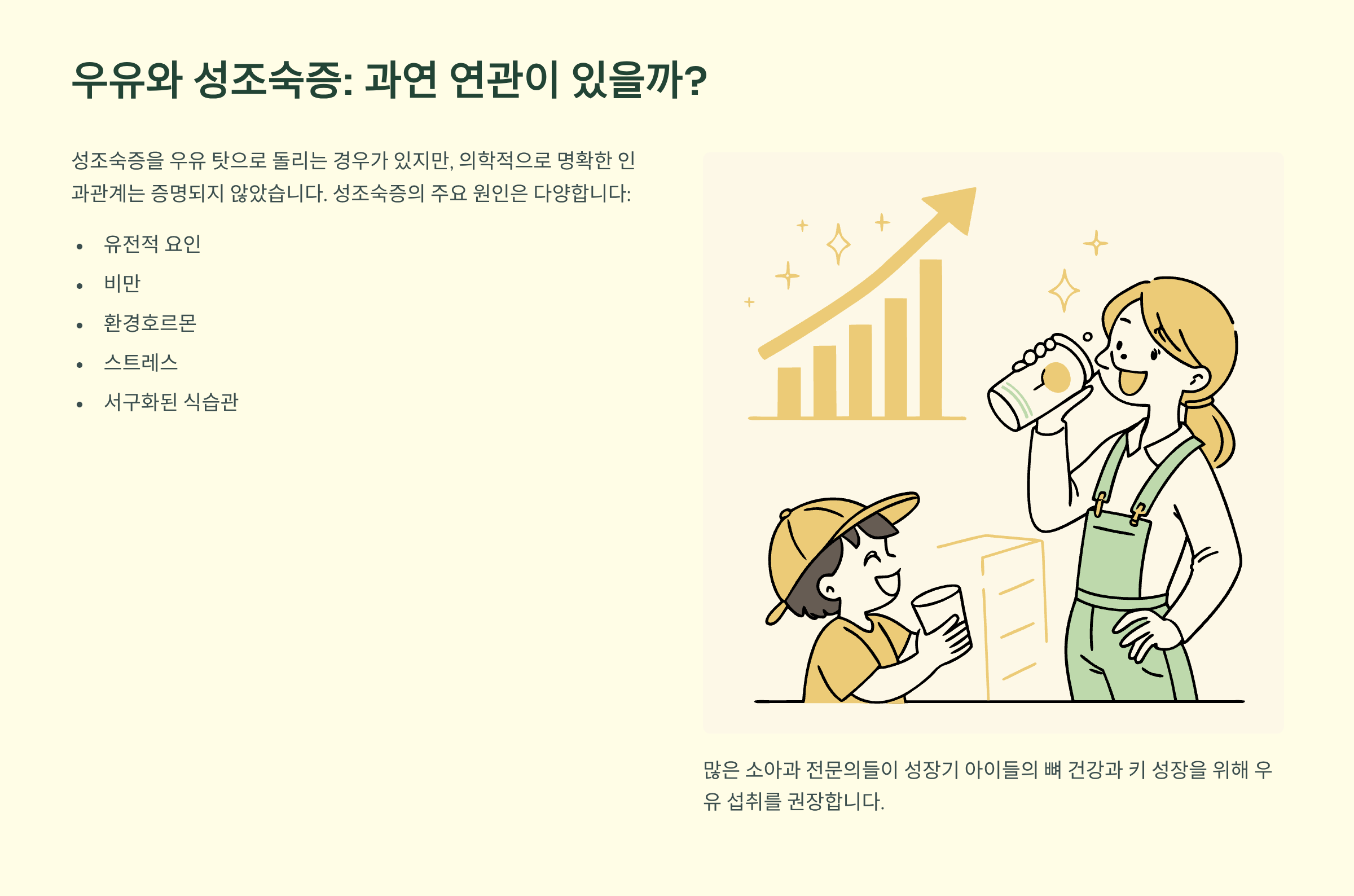 성조숙증을 우유 탓으로 돌리는 분들이 있지만, 의학적으로 명확한 인과관계는 증명되지 않았어요. 성조숙증의 주요 원인들을 살펴보면:
