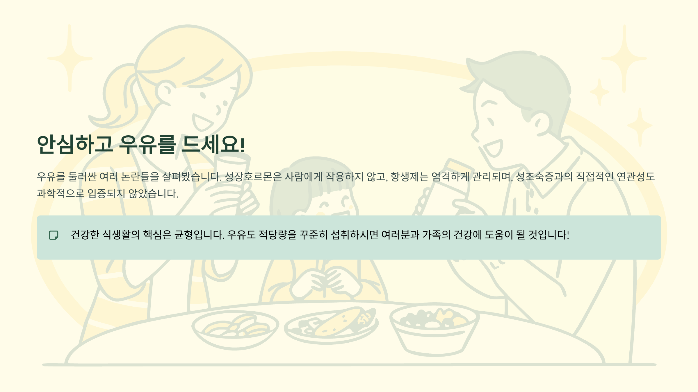 지금까지 우유를 둘러싼 여러 논란들을 자세히 살펴봤어요. 성장호르몬은 사람에게 작용하지 않고, 항생제는 엄격하게 관리되고 있으며, 성조숙증과의 직접적인 연관성도 과학적으로 입증되지 않았어요.