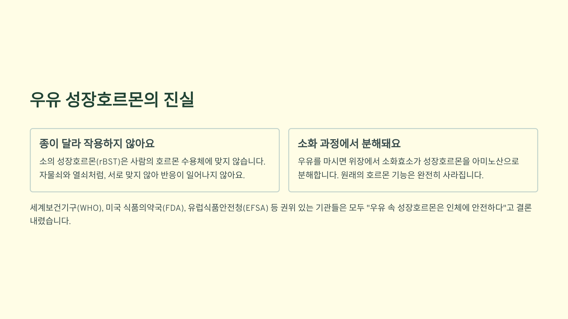 세계보건기구(WHO), 미국 식품의약국(FDA), 유럽식품안전청(EFSA) 등 권위 있는 기관들은 모두 "우유 속 성장호르몬은 인체에 안전하다"고 결론내렸어요.