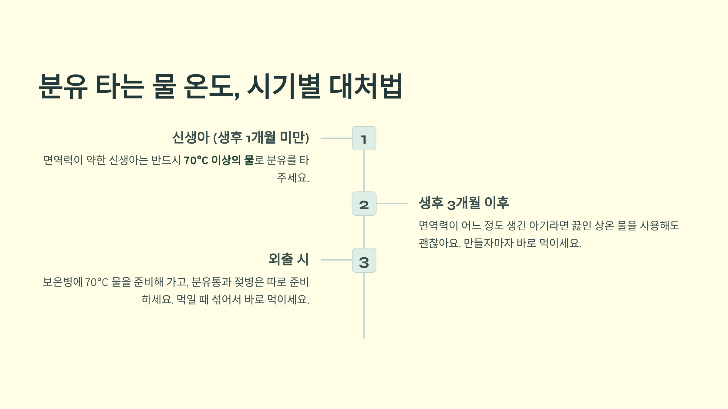 분유 타는 물 온도, 생각보다 복잡하지 않죠? 핵심은 70°C 이상의 물로 타서 보관할 수 있고, 끓인 상온 물로 타면 바로 먹여야 한다는 거예요.