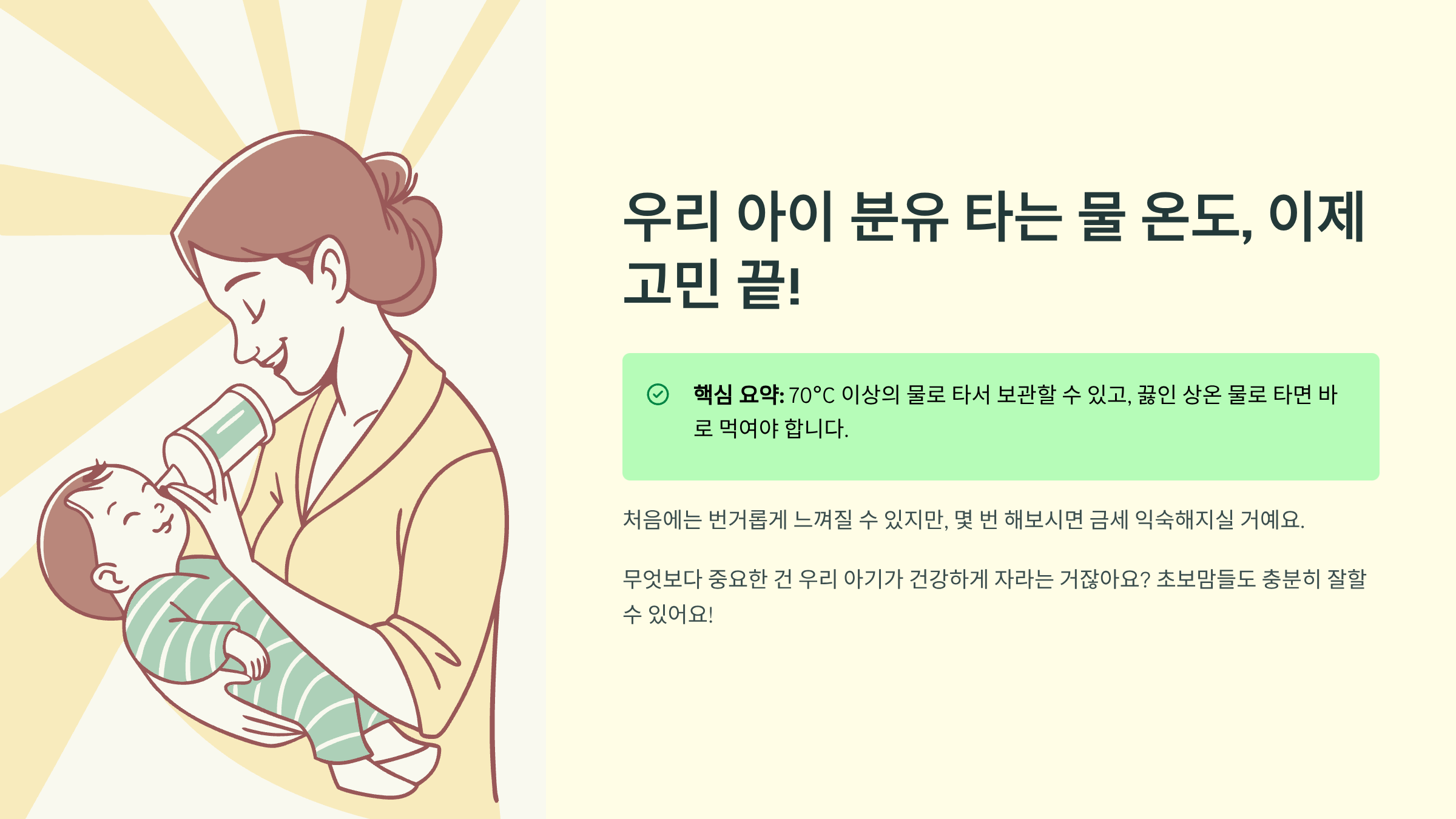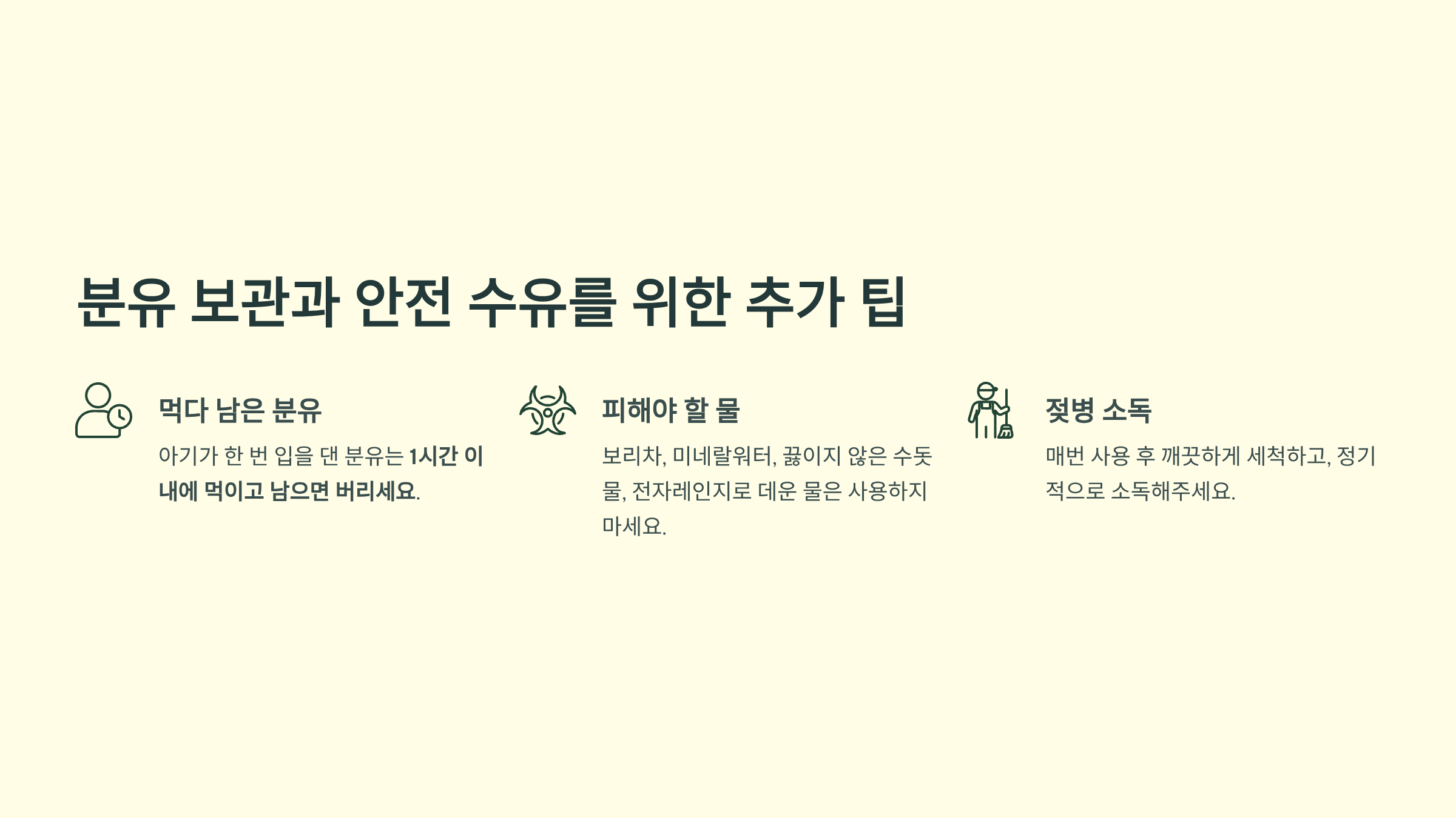 무엇보다 중요한 건 우리 아기가 건강하게 자라는 거잖아요? 조금 번거로워도 안전한 방법으로 분유를 타서, 우리 소중한 아이가 튼튼하게 자랄 수 있도록 해요. 초보맘들도 충분히 잘할 수 있어요!