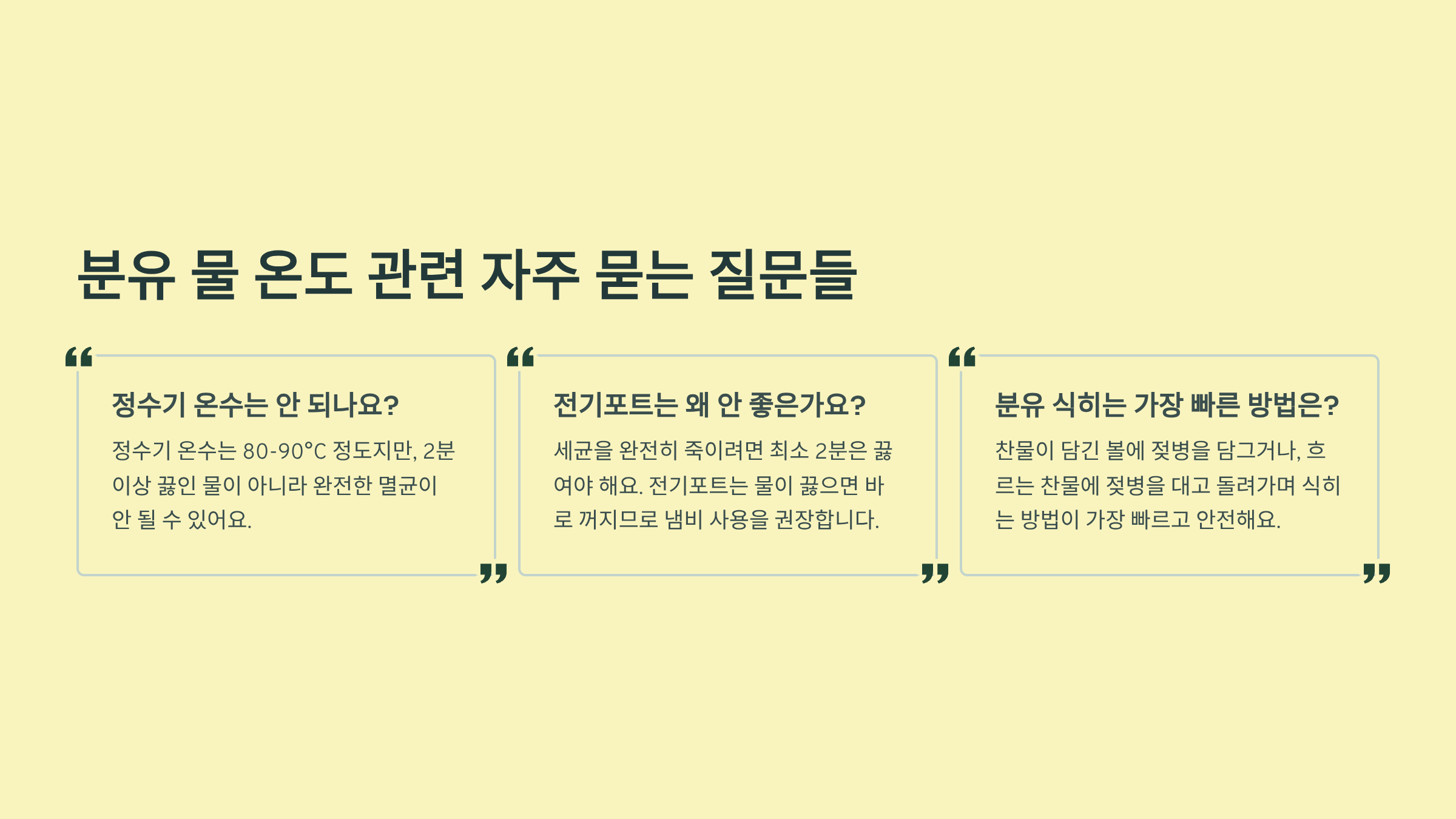 정수기 온수는 대부분 80-90°C 정도로 나오는데, 2분 이상 끓인 물이 아니라서 완전한 멸균이 안 될 수 있어요. 가능하면 냄비에서 직접 끓인 물을 사용하는 걸 추천해요.