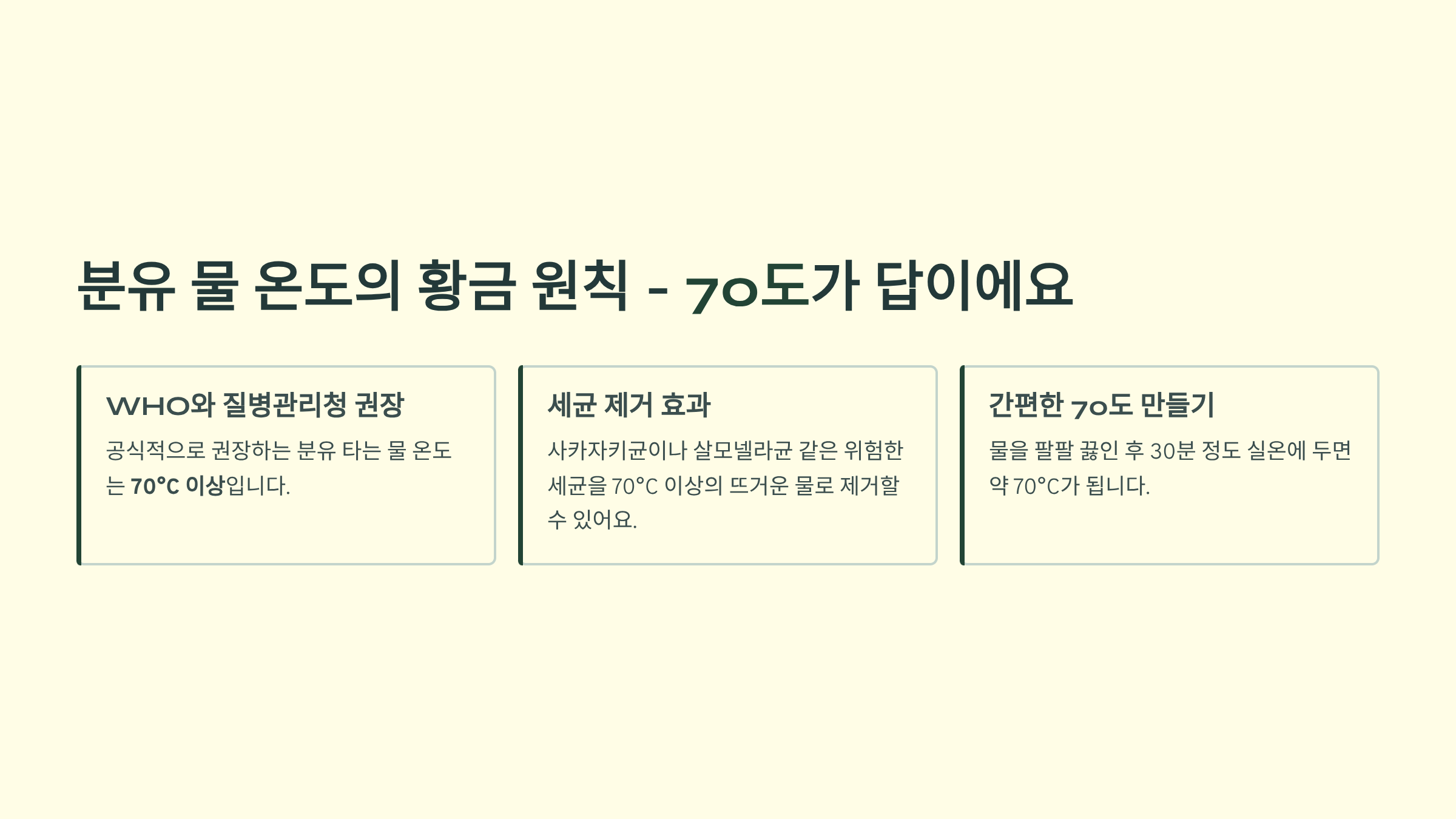 먼저 결론부터 말씀드릴게요. 세계보건기구(WHO)와 우리나라 질병관리청에서 공식적으로 권장하는 분유 타는 물 온도는 70°C 이상이에요.