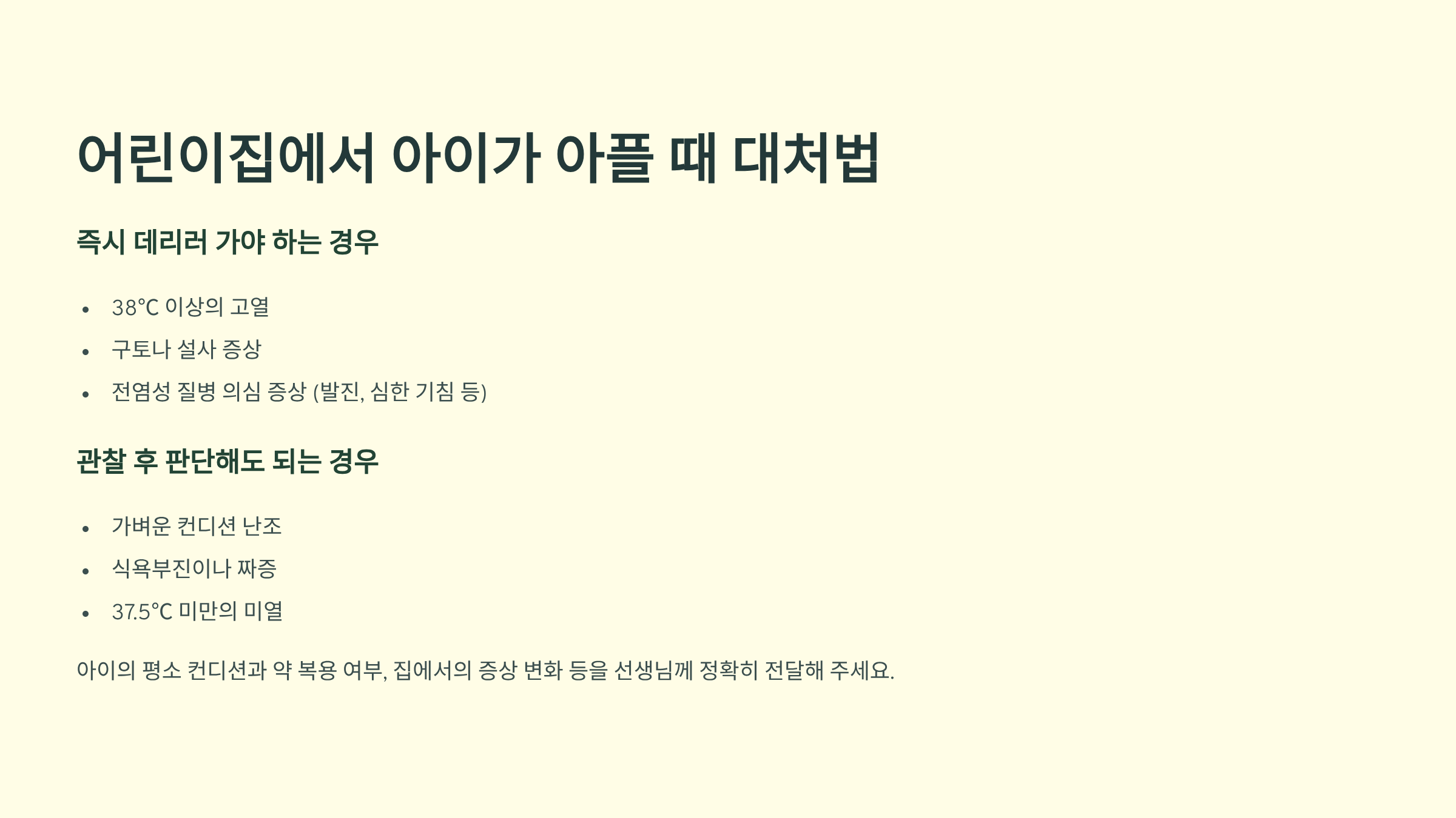 - 아이 상태 우선: 증상이 심하면 건강 회복을 위해 집에서 휴식