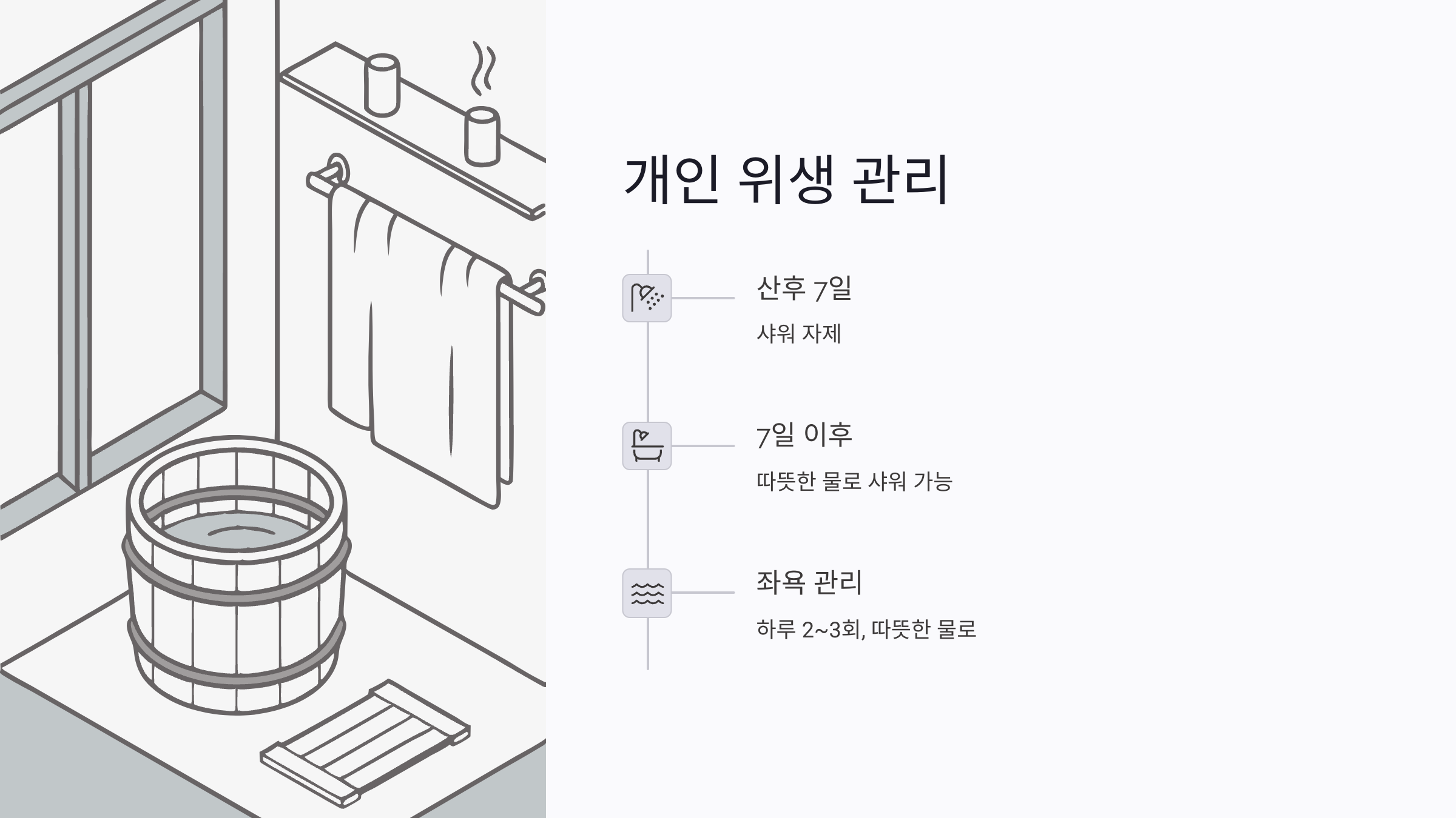 샤워할 때는 꼭 따뜻한 물을 사용해야 하며, 찬물 샤워는 피해야 합니다. 출산 후 일주일이 지났을 때부터 따뜻한 물로 샤워하는 것이 가능하지만, 항상 몸이 냉해지지 않도록 주의해야 해요.