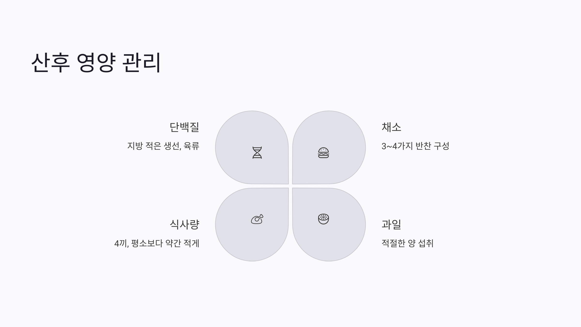- 식사 횟수와 양: 4끼 식사를 할 경우, 평소 양보다 약간씩 줄여 먹는 것이 소화도 잘 되고 모유 생성에도 도움이 됩니다.