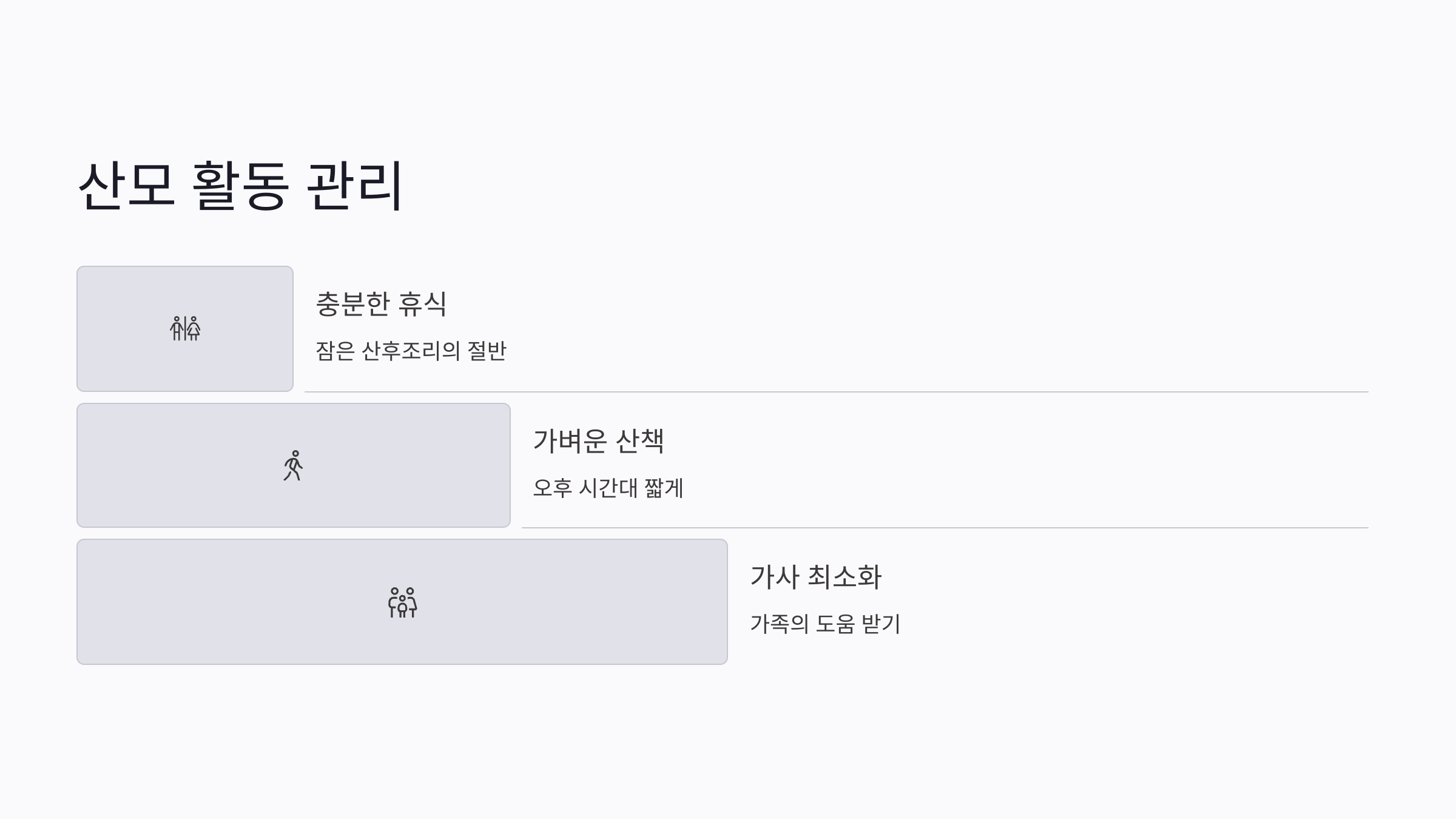 여름철이라도 산모는 무리한 활동을 피하고 충분한 휴식을 취해야 합니다. 가벼운 걷기는 혈액순환과 오로 배출에 도움이 되며, 햇빛이 강하지 않은 오후 시간대에 짧게 산책하는 것이 좋습니다.