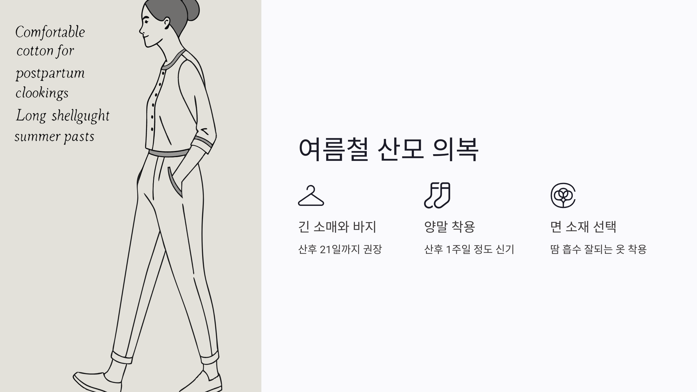"이 더위에 어떻게 긴 옷을 입나요?"라고 생각하실 수 있지만, 여름철에도 산모는 몸을 적절히 보호하는 것이 좋습니다. 특히 산후 21일까지는 가능한 긴 소매 옷과 긴 바지를 입어 찬 바람이 직접 피부에 닿지 않도록 하세요.