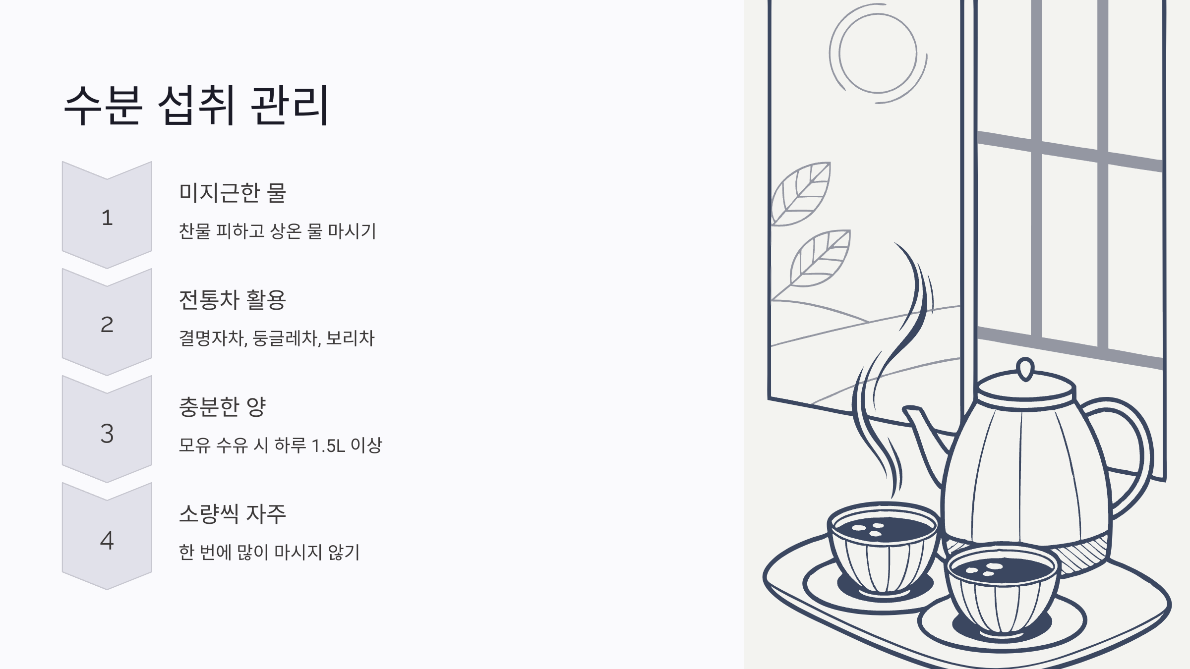 여름철에는 땀으로 인한 수분 손실이 많아 충분한 수분 섭취가 중요합니다. 하지만 찬물은 피해야 하며, 물은 상온에 두어 미지근한 상태로 조금씩 자주 마시는 것이 좋아요.