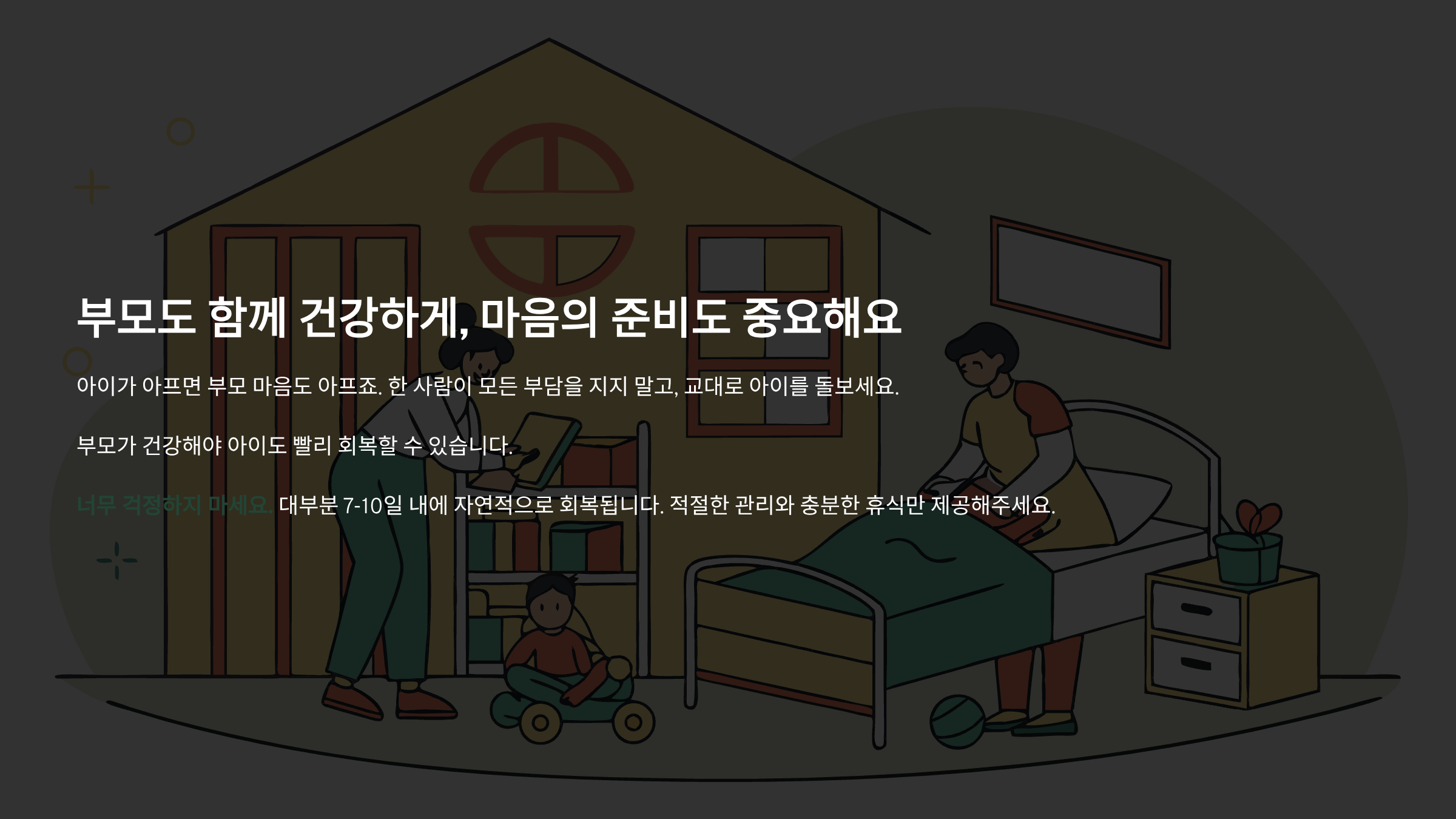 한 사람이 모든 부담을 지지 말고, 교대로 아이를 돌보면서 충분한 휴식도 취하세요. 부모가 건강해야 아이도 빨리 회복할 수 있으니까요.