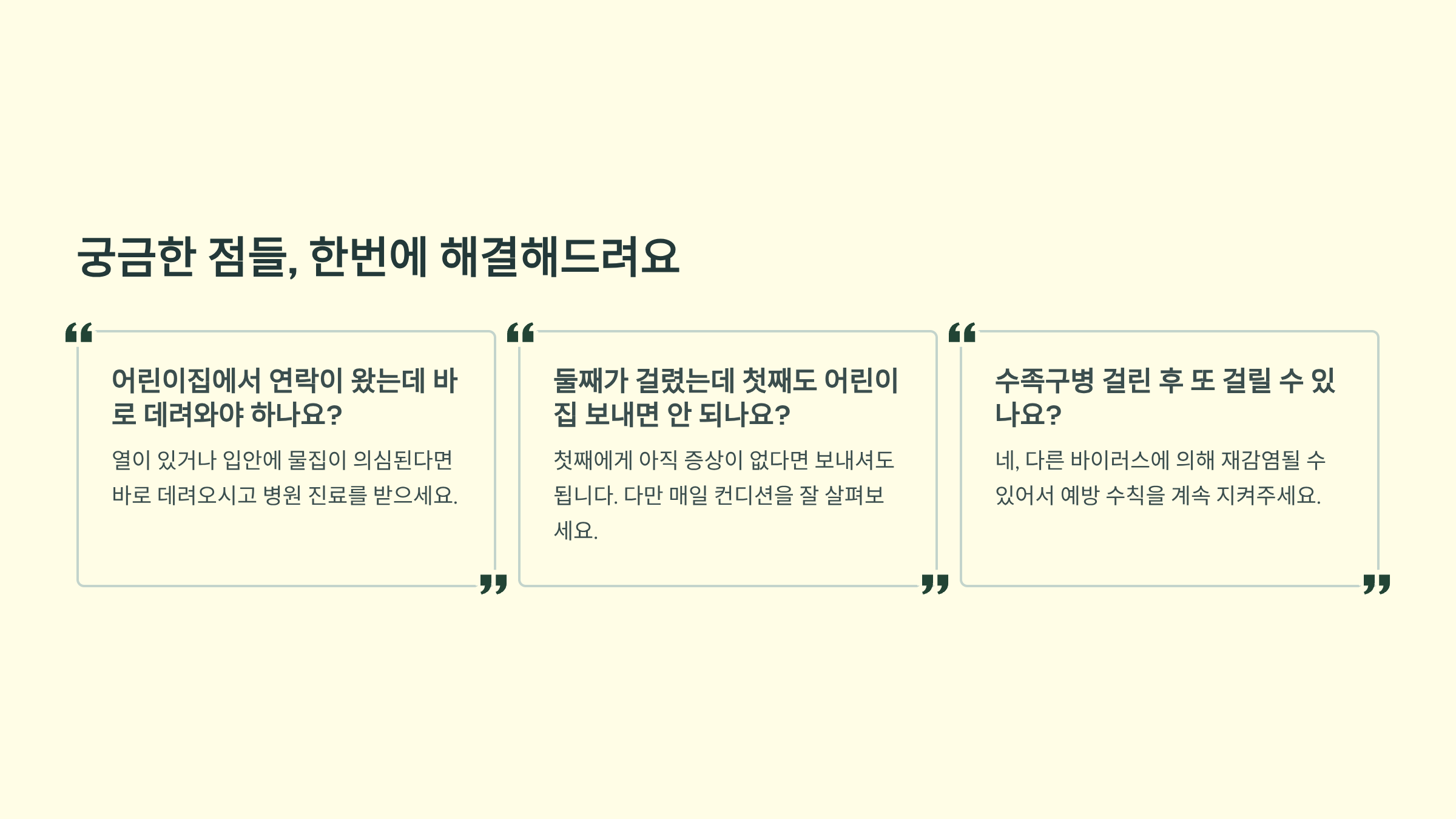 Q. 어린이집에서 연락이 왔는데 바로 데려와야 하나요? A. 열이 있거나 입안에 물집이 의심된다면 바로 데려오시고 병원 진료를 받으세요.