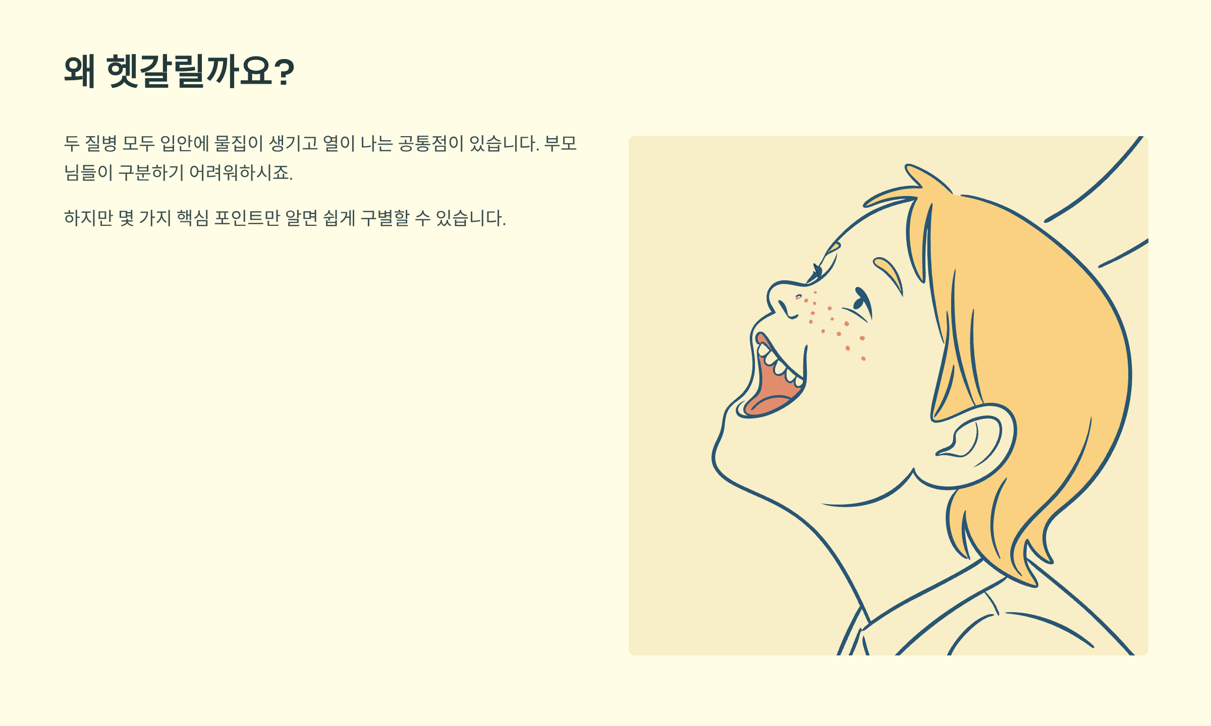 두 질병 모두 입안에 물집이 생기고 열이 나는 공통점이 있어서 부모님들이 구분하기 어려워하시는데요. 하지만 몇 가지 핵심 포인트만 알면 쉽게 구별할 수 있답니다.