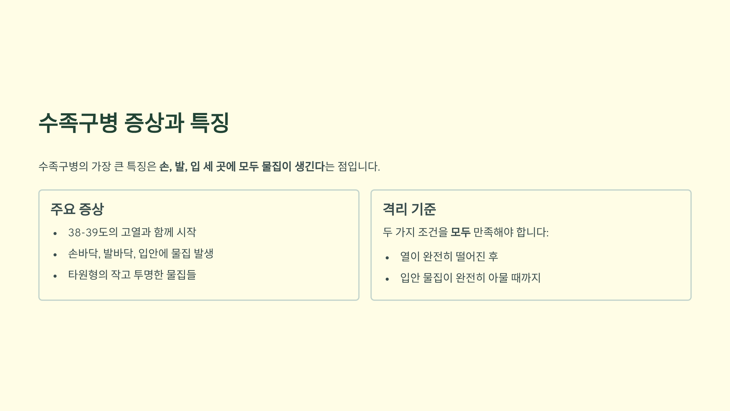 수족구병 격리 기준은 다른 질병보다 까다로워요. 두 가지 조건을 모두 만족해야 합니다: