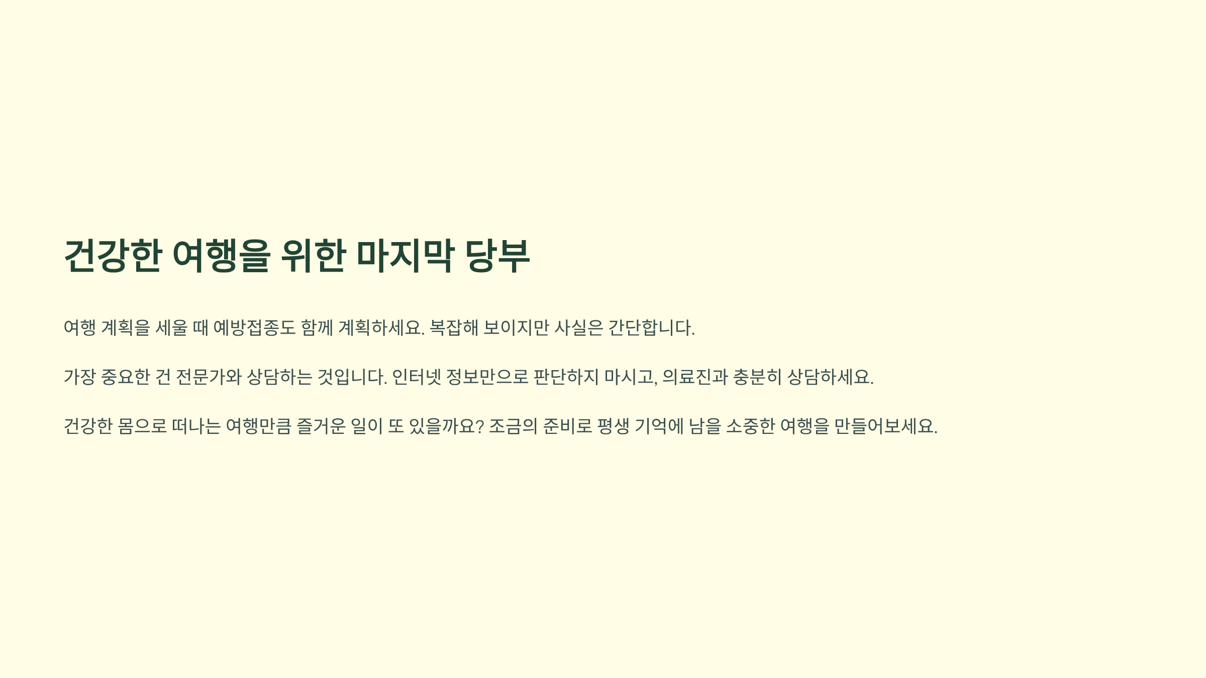 건강한 몸으로 떠나는 여행만큼 즐거운 일이 또 있을까요? 조금의 준비로 평생 기억에 남을 소중한 여행을 만들어보세요. 여러분의 안전하고 즐거운 여행을 진심으로 응원할게요!