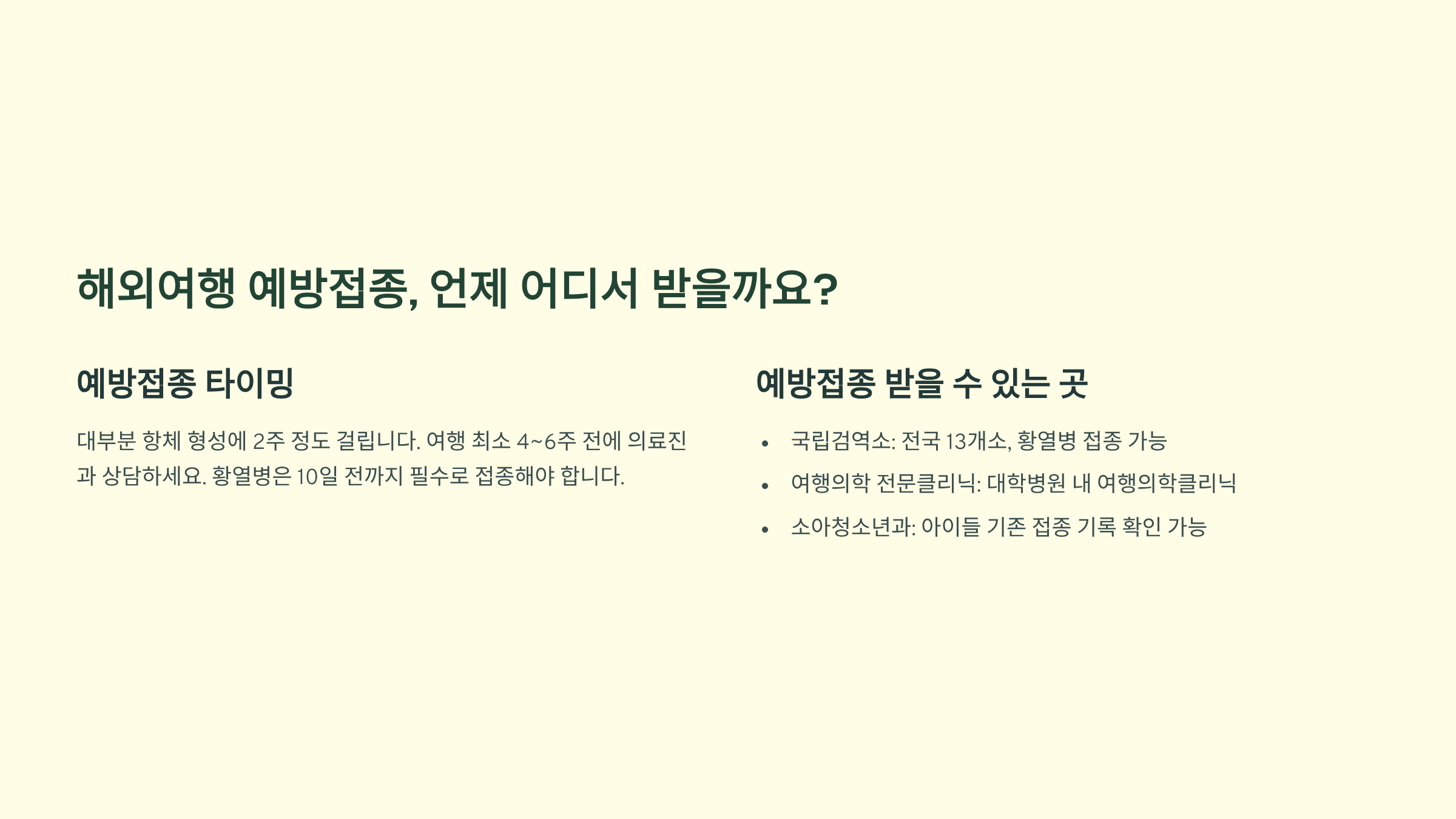 대부분의 예방접종은 항체가 형성되는 데 2주 정도 걸려요. 그래서 여행 최소 4~6주 전에는 의료진과 상담을 받는 것이 좋아요. 특히 황열병 같은 경우는 10일 전까지 필수로 접종해야 하니 일정을 꼼꼼히 확인하세요.