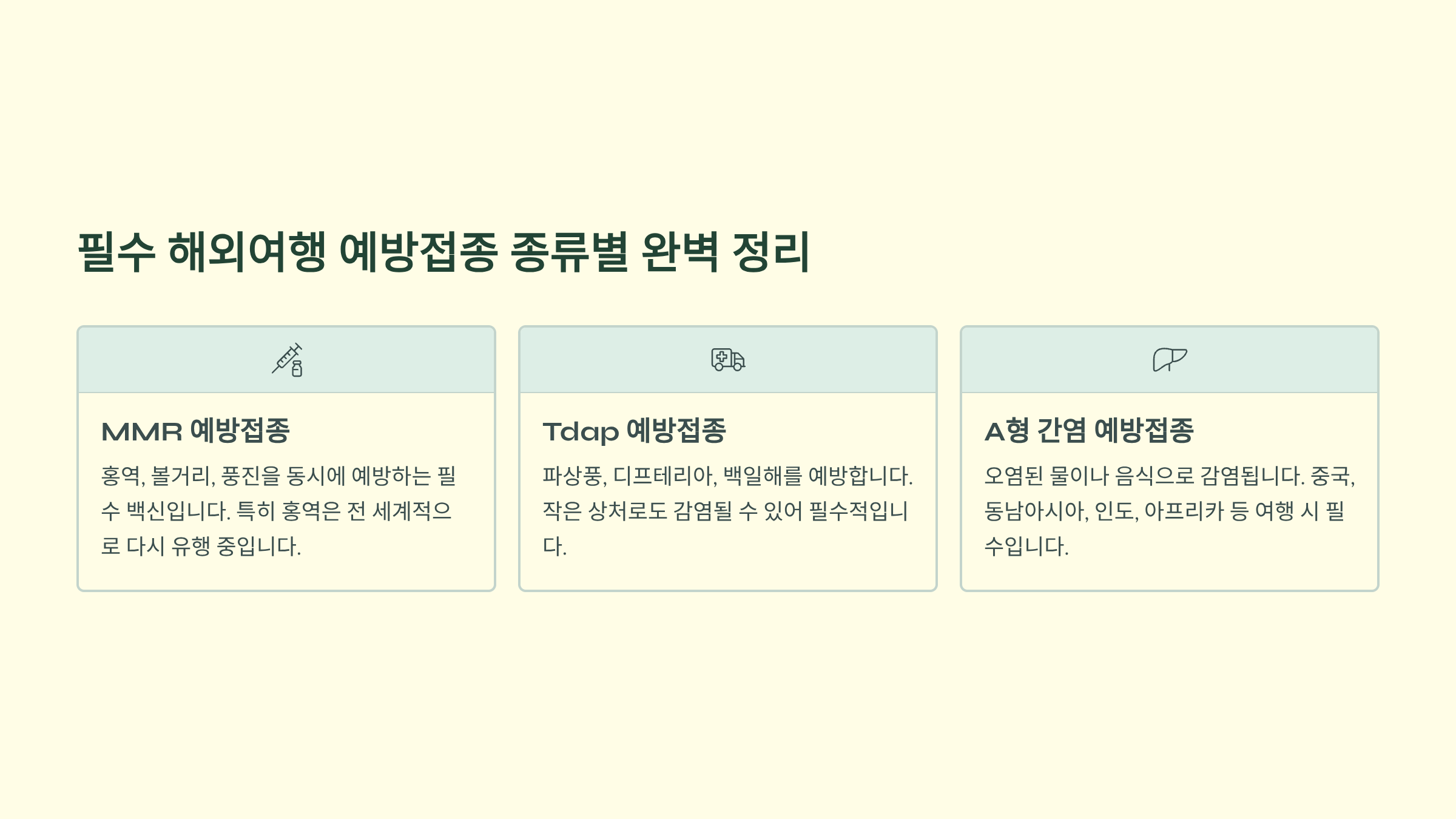 많은 분들이 항공료, 숙박, 관광지는 꼼꼼히 알아보면서도 정작 건강 관리는 놓치는 경우가 많더라고요. 하지만 여행 중 아프면 정말 고생이죠. 오늘은 해외여행 전 꼭 챙겨야 할 예방접종에 대해 자세히 알려드릴게요.