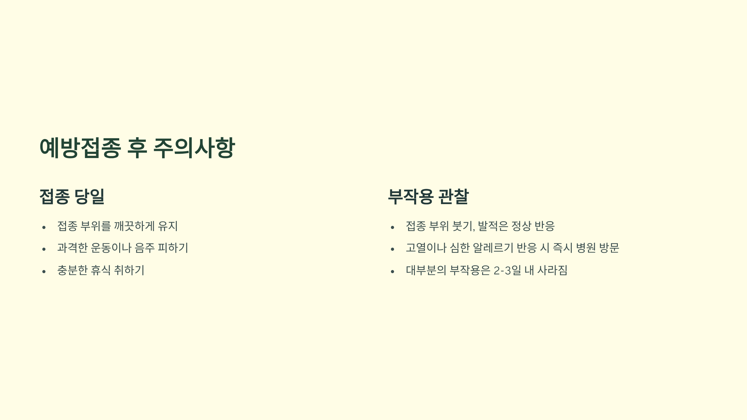 예방접종 후에는 몇 가지 주의할 점이 있어요.