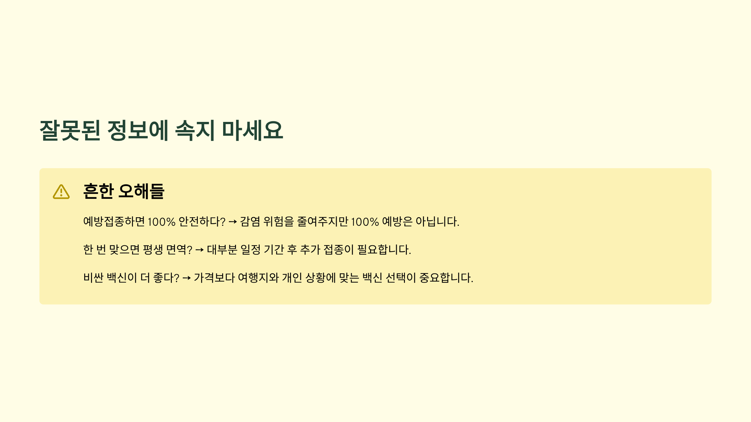 오해 3: "비싼 백신이 더 좋아" → 가격보다는 여행지와 개인 상황에 맞는 백신 선택이 중요해요.