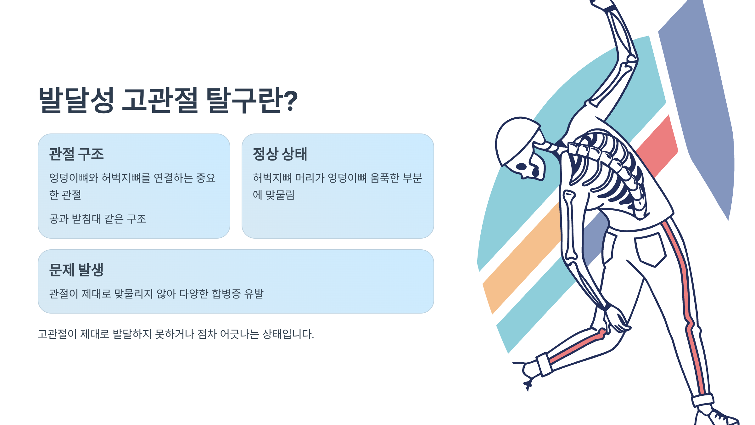 발달성 고관절 탈구는 우리 몸에서 가장 큰 관절인 고관절이 제대로 발달하지 못하거나, 시간이 지나면서 점차 어긋나는 상태를 말해요.