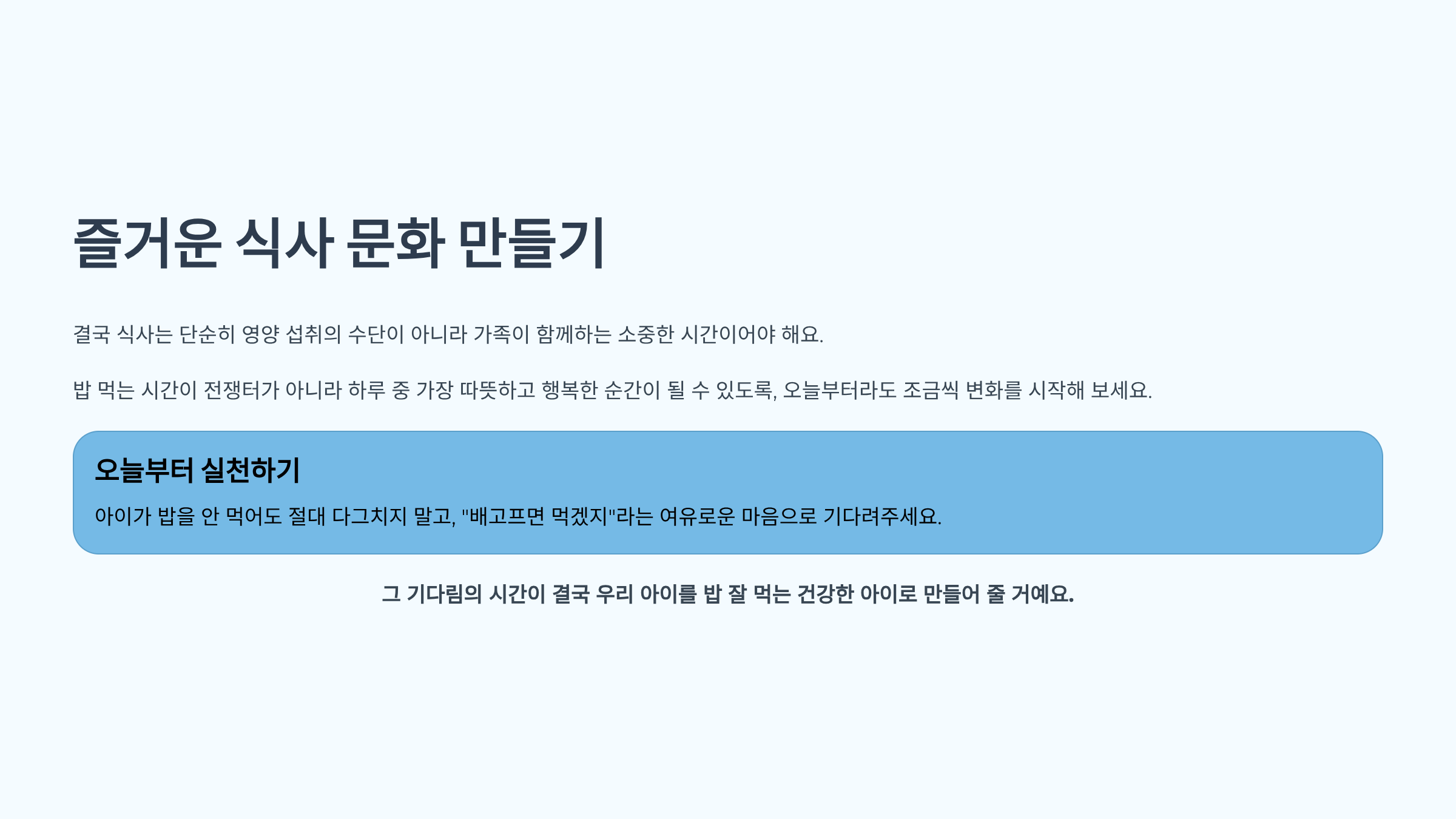 아이가 밥을 안 먹어도 절대 다그치지 말고, "배고프면 먹겠지"라는 여유로운 마음으로 기다려주세요. 그 기다림의 시간이 결국 우리 아이를 밥 잘 먹는 건강한 아이로 만들어 줄 거예요.