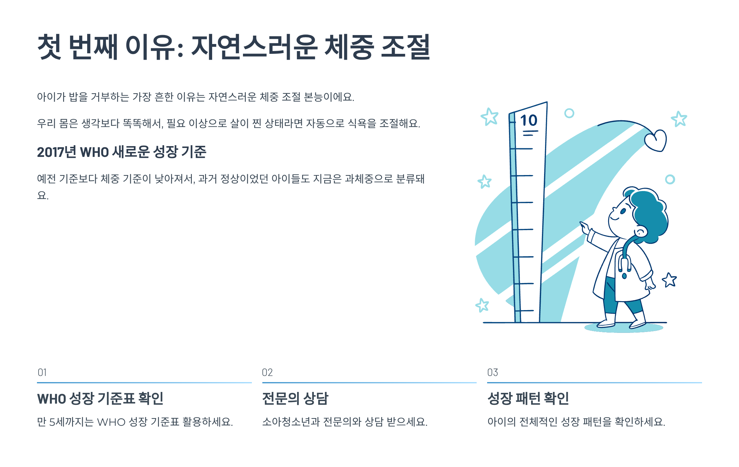 만약 아이가 실제로 과체중이라면? 억지로 더 먹이려고 노력하지 마세요. 아이 스스로 적정량을 조절할 수 있도록 믿고 기다려주는 게 최선이에요.