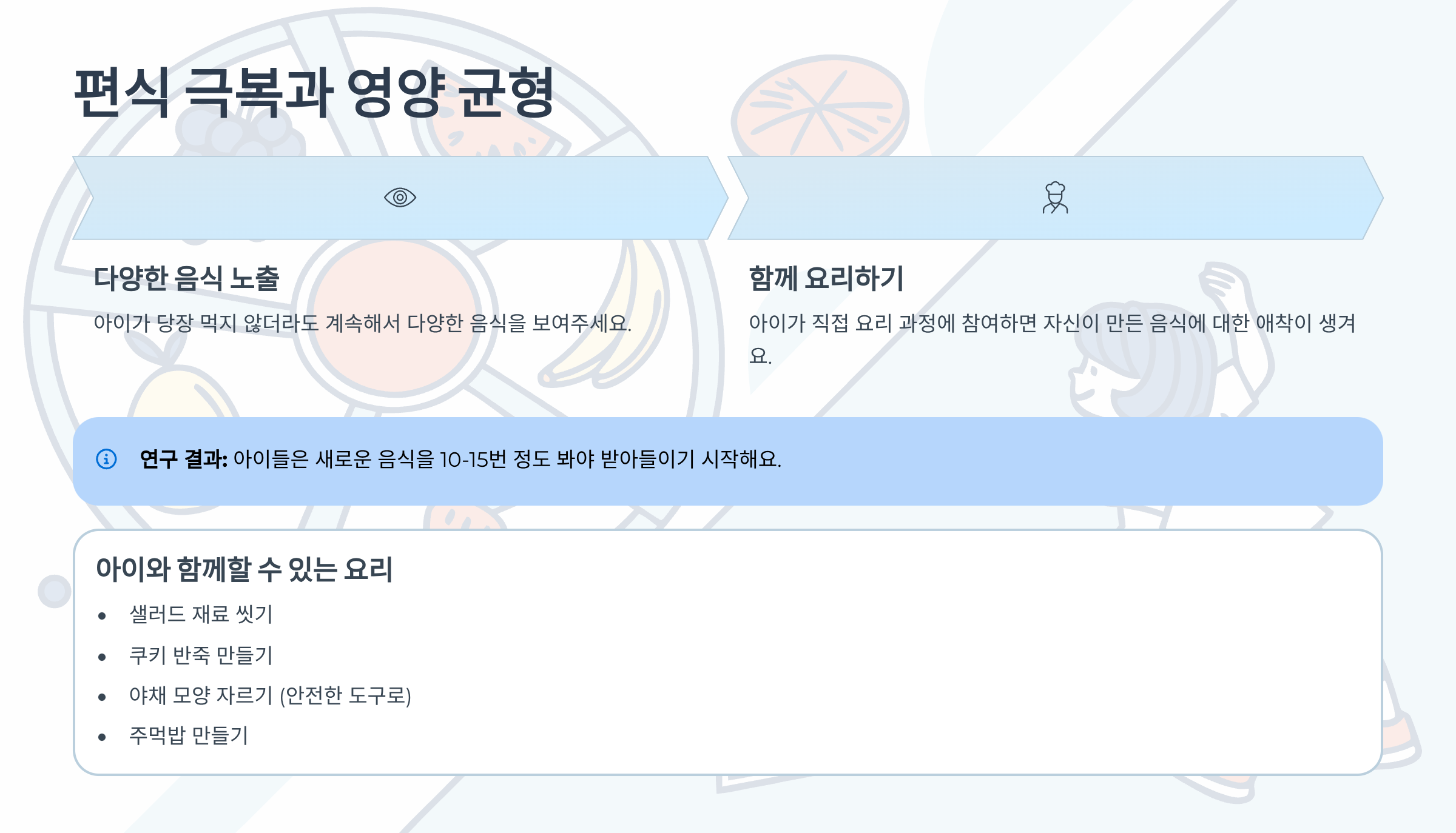 아이가 당장 먹지 않더라도 계속해서 다양한 음식을 보여주세요. 연구에 따르면 아이들은 새로운 음식을 10-15번 정도 봐야 받아들이기 시작한다고 해요.