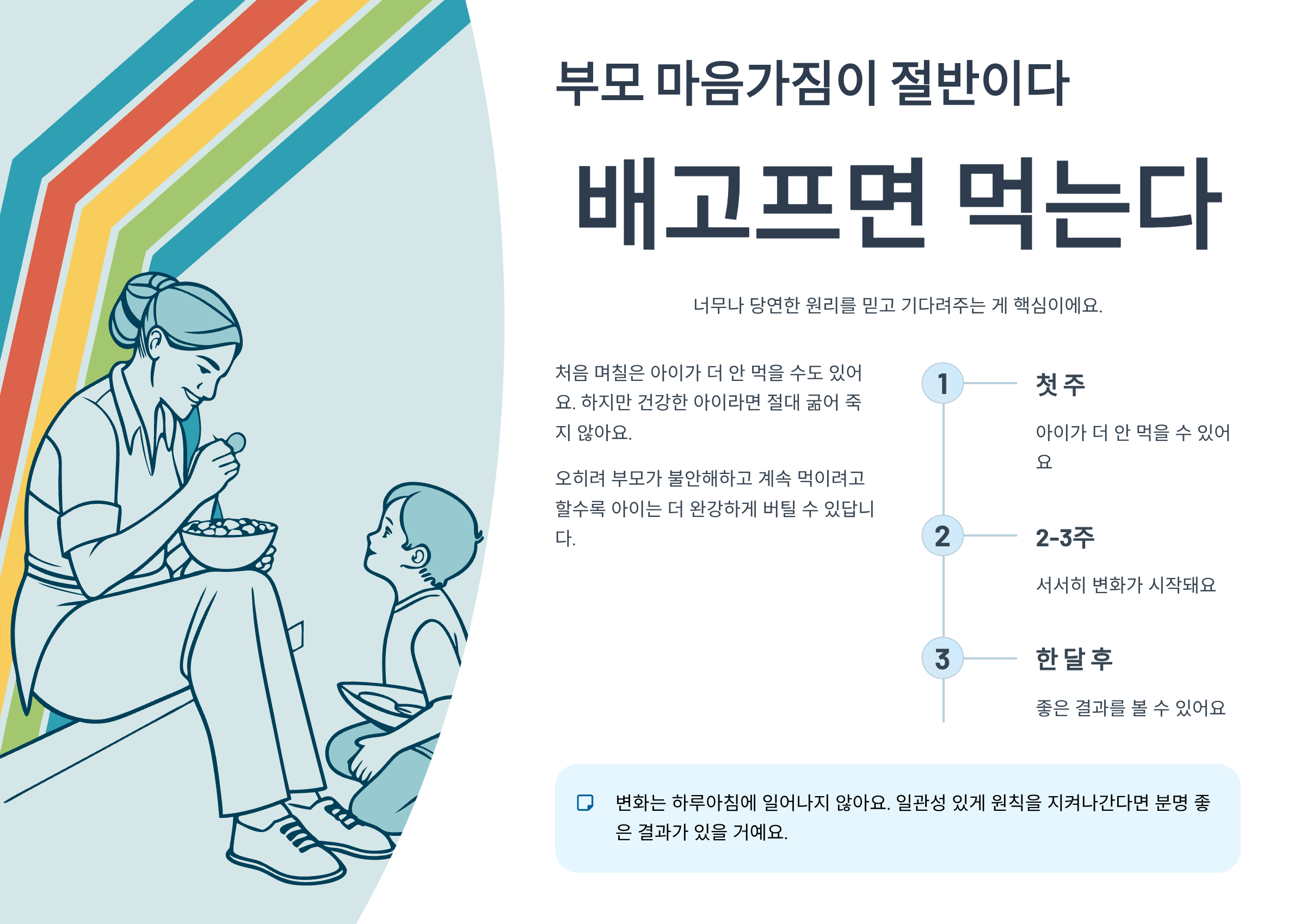 사실 이 모든 방법들 중에서 가장 중요한 건 부모님의 마음가짐이에요. **"배고프면 먹는다"**는 너무나 당연한 원리를 믿고 기다려주는 게 핵심이거든요.