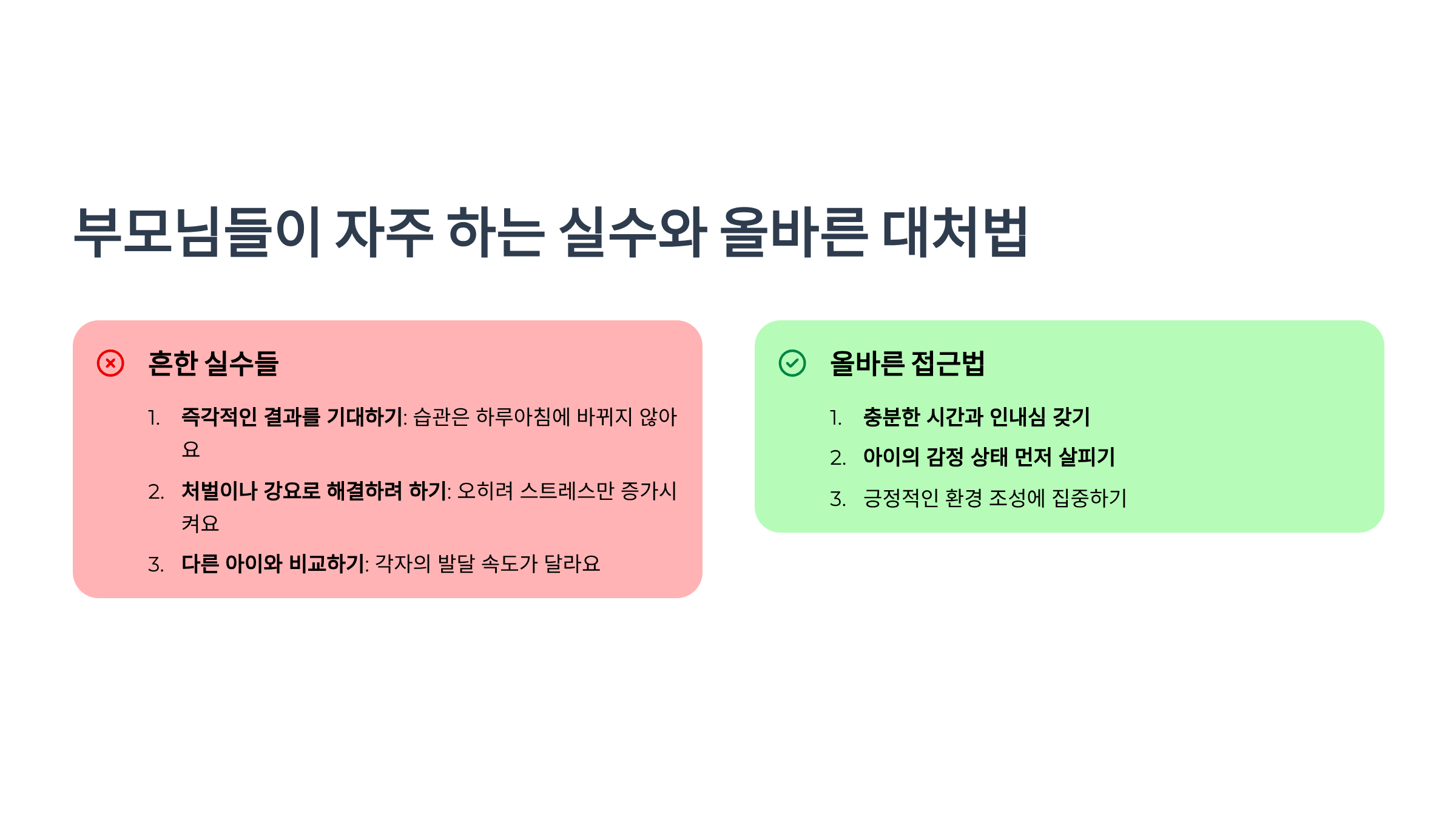 - 처벌이나 강요로 해결하려 하기: 오히려 스트레스만 증가시켜요