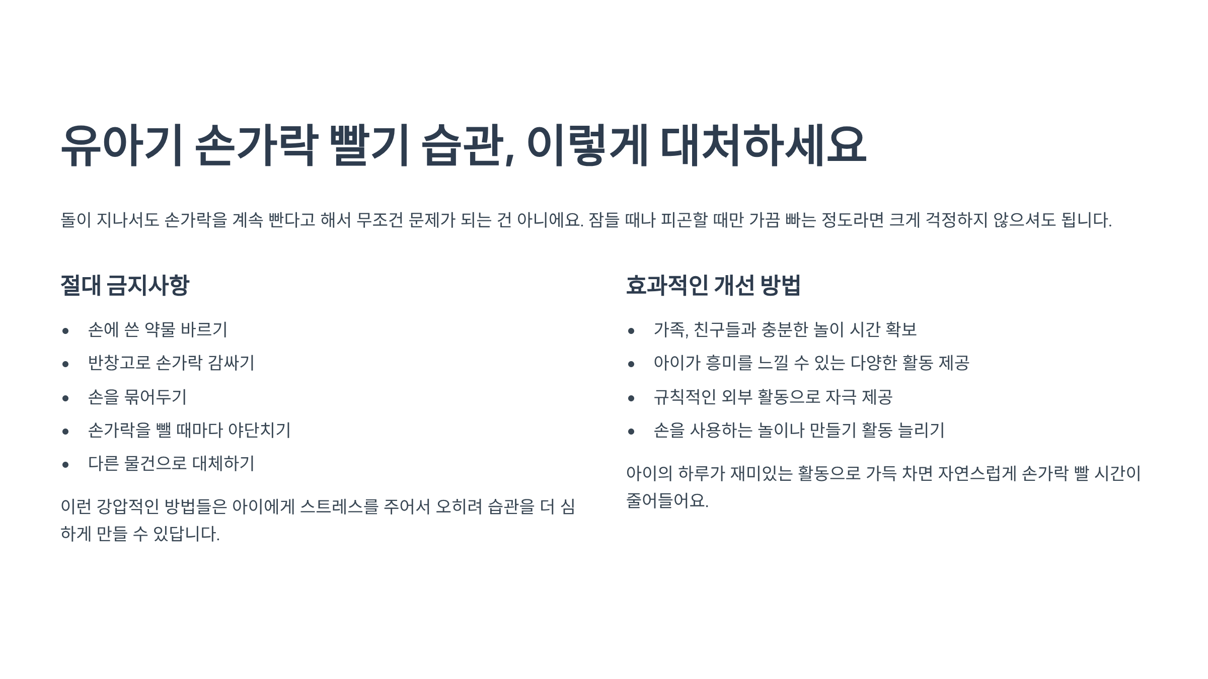 이런 강압적인 방법들은 아이에게 스트레스를 주어서 오히려 손가락 빨기 습관을 더 심하게 만들 수 있답니다.