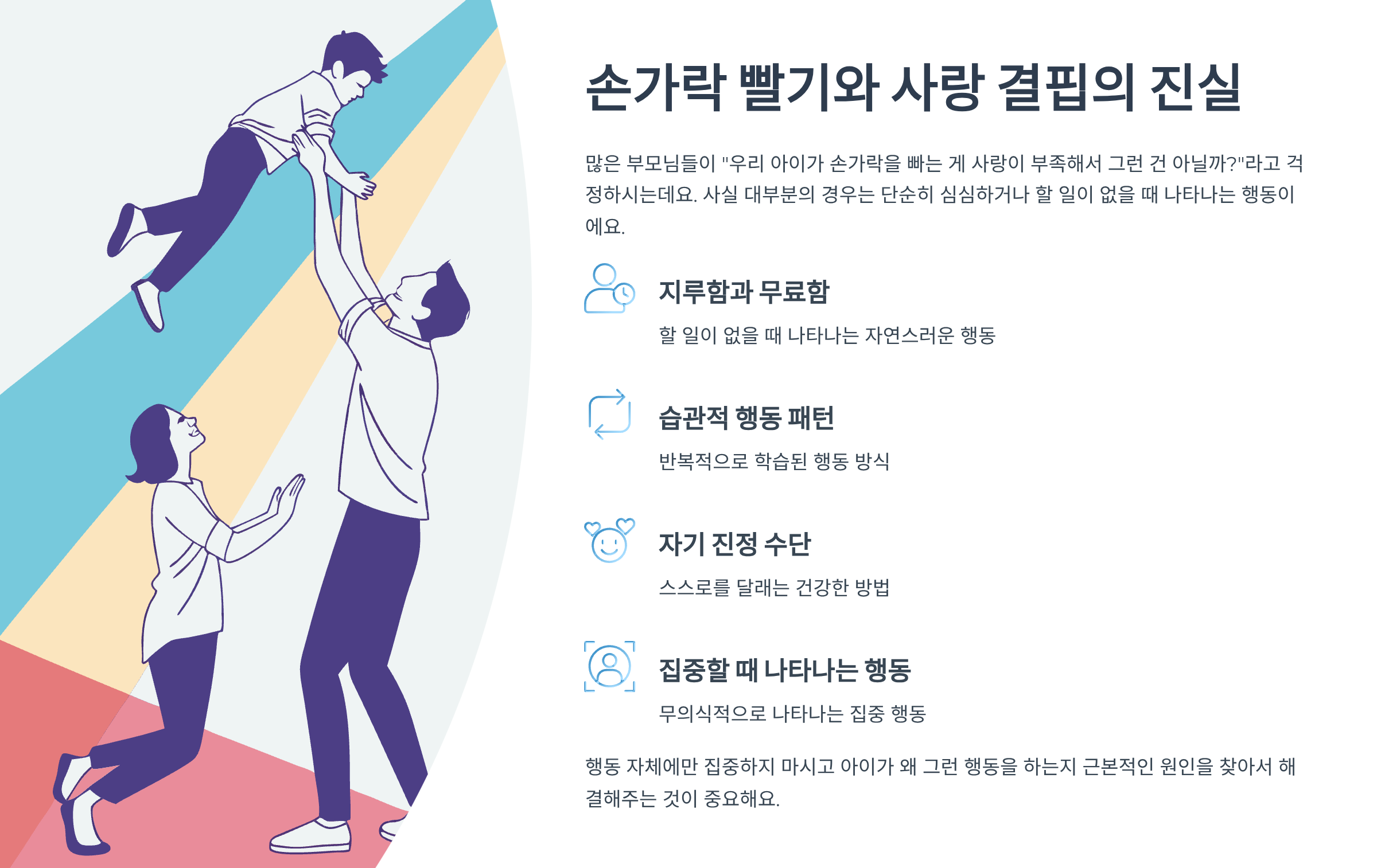 많은 부모님들이 "우리 아이가 손가락을 빠는 게 사랑이 부족해서 그런 건 아닐까?"라고 걱정하시는데요. 사실 대부분의 경우는 단순히 심심하거나 할 일이 없을 때 나타나는 행동이에요.