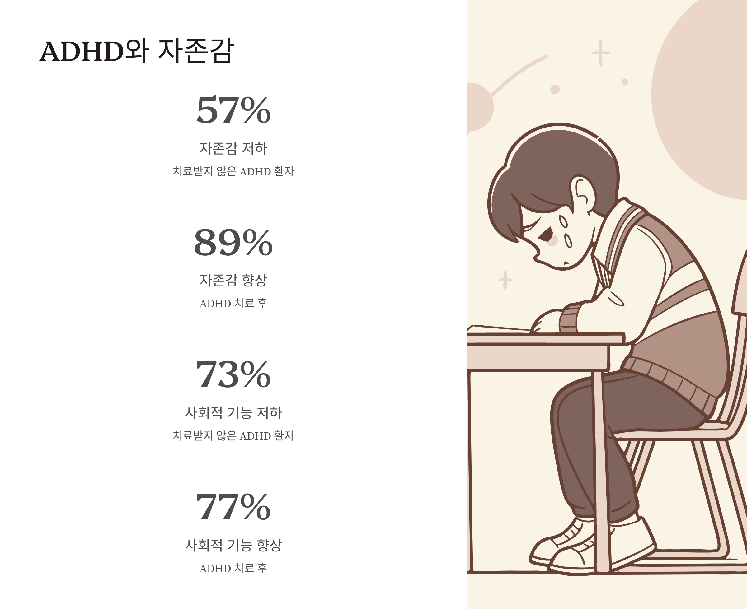 ADHD 아동들은 증상으로 인해 가족, 친구, 선생님들에게 부정적인 피드백을 자주 받게 되고, 이로 인해 자존감에 상처를 입게 됩니다. 연구에 따르면, 치료받지 않은 ADHD 환자들은 비ADHD 대조군에 비해 자존감이 57%, 사회적 기능이 73% 저하되어 있다고 합니다. 반면, ADHD를 치료했을 때는 자존감이 89%, 사회적 기능은 77% 향상되었다고 해요.