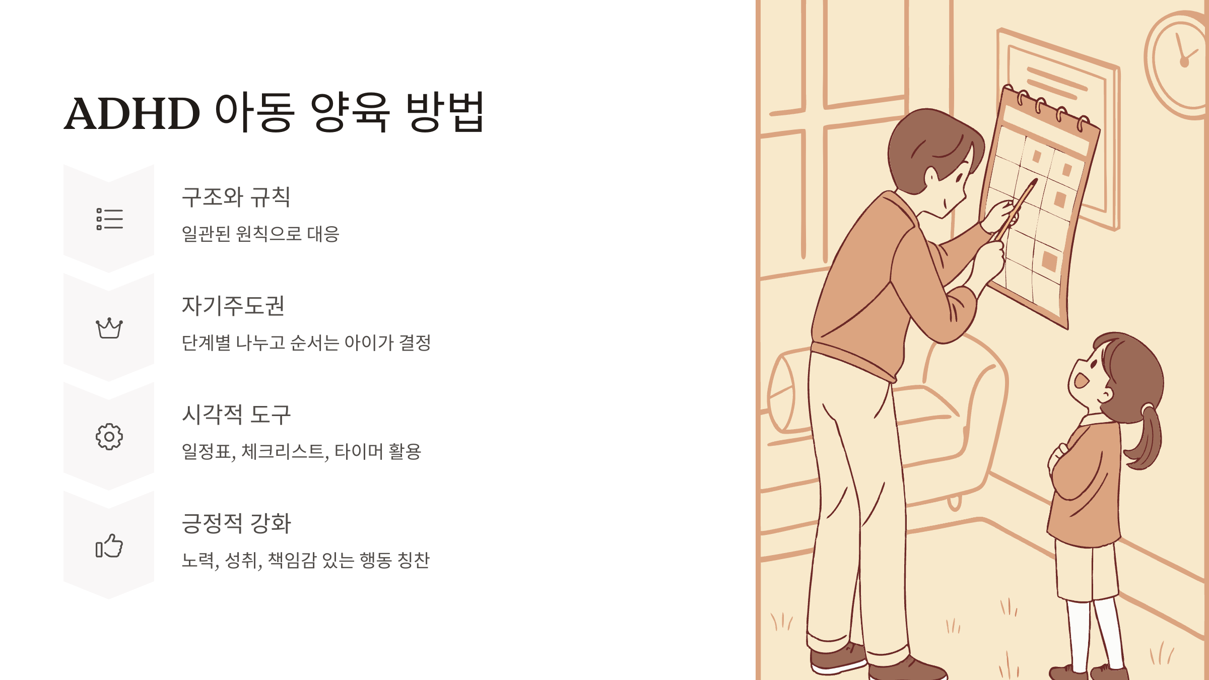 ADHD 아이에게 자기주도권을 부여하는 것은 생각보다 큰 효과가 있습니다. 해야 할 일을 단계별로 나누고 순서는 아이가 직접 정하게 하면, 무겁던 엉덩이가 살짝 가벼워지고 공부하는 것도 덜 어렵게 느낄 수 있습니다.