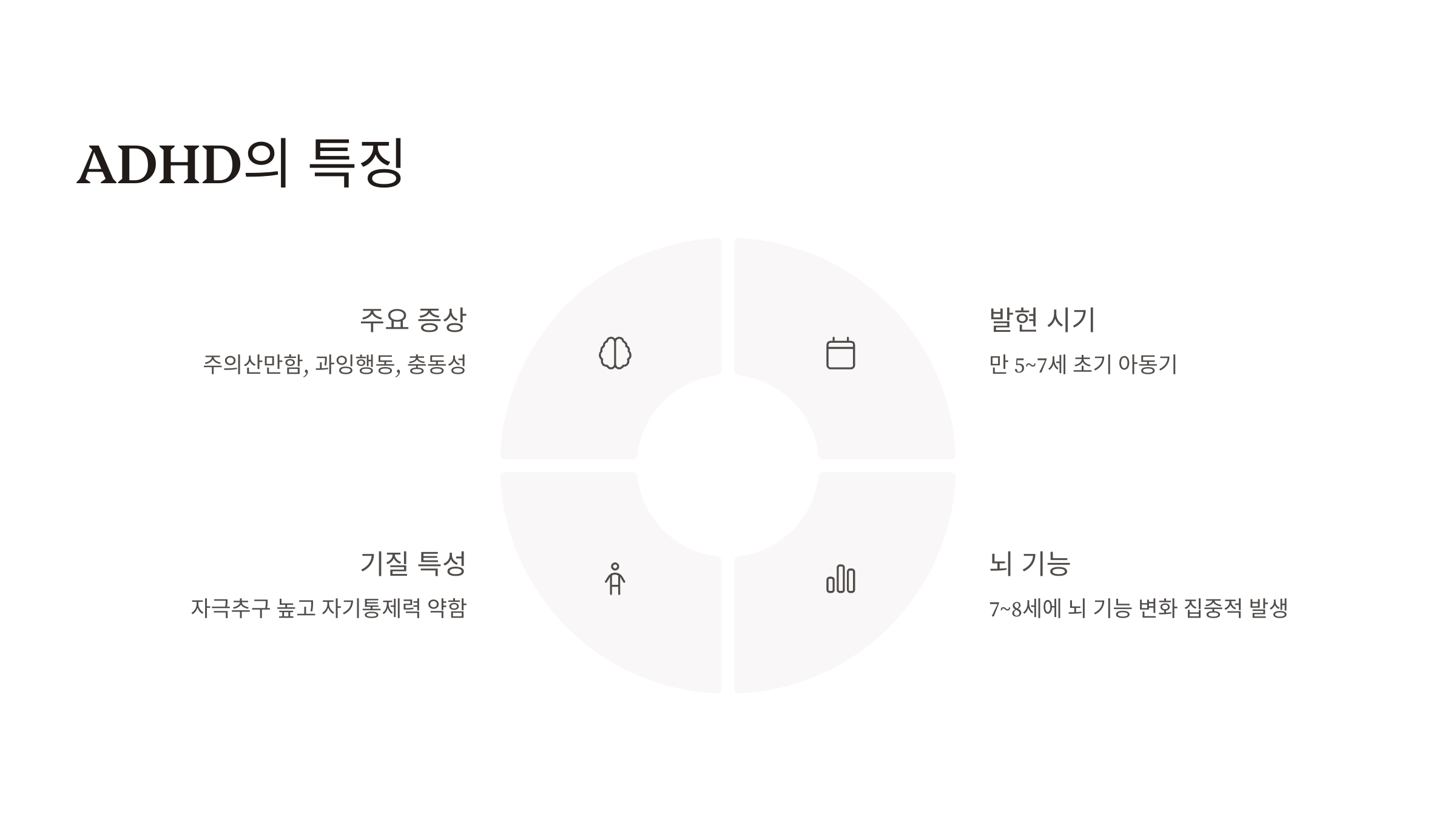 ADHD는 주의산만함, 과잉행동, 충동성을 주요 증상으로 하는 정신건강 질환입니다. 보통 만 5~7세 무렵 초기 아동기에 나타나며, 일부는 치료 없이도 좋아지지만 대부분 만성적인 경과를 보입니다.