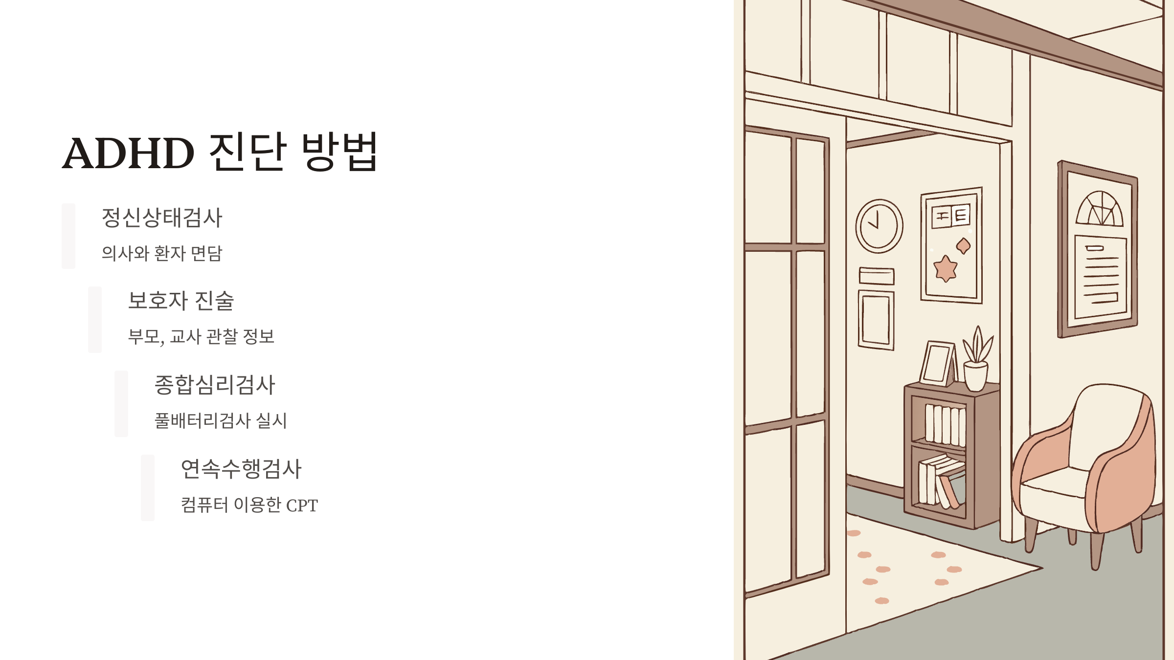 ADHD 진단은 정신건강의학과 의사가 환자와의 면담(정신상태검사), 보호자의 진술, 종합심리검사(풀배터리검사), 컴퓨터를 이용한 연속수행검사(CPT) 등을 통해 이루어집니다.