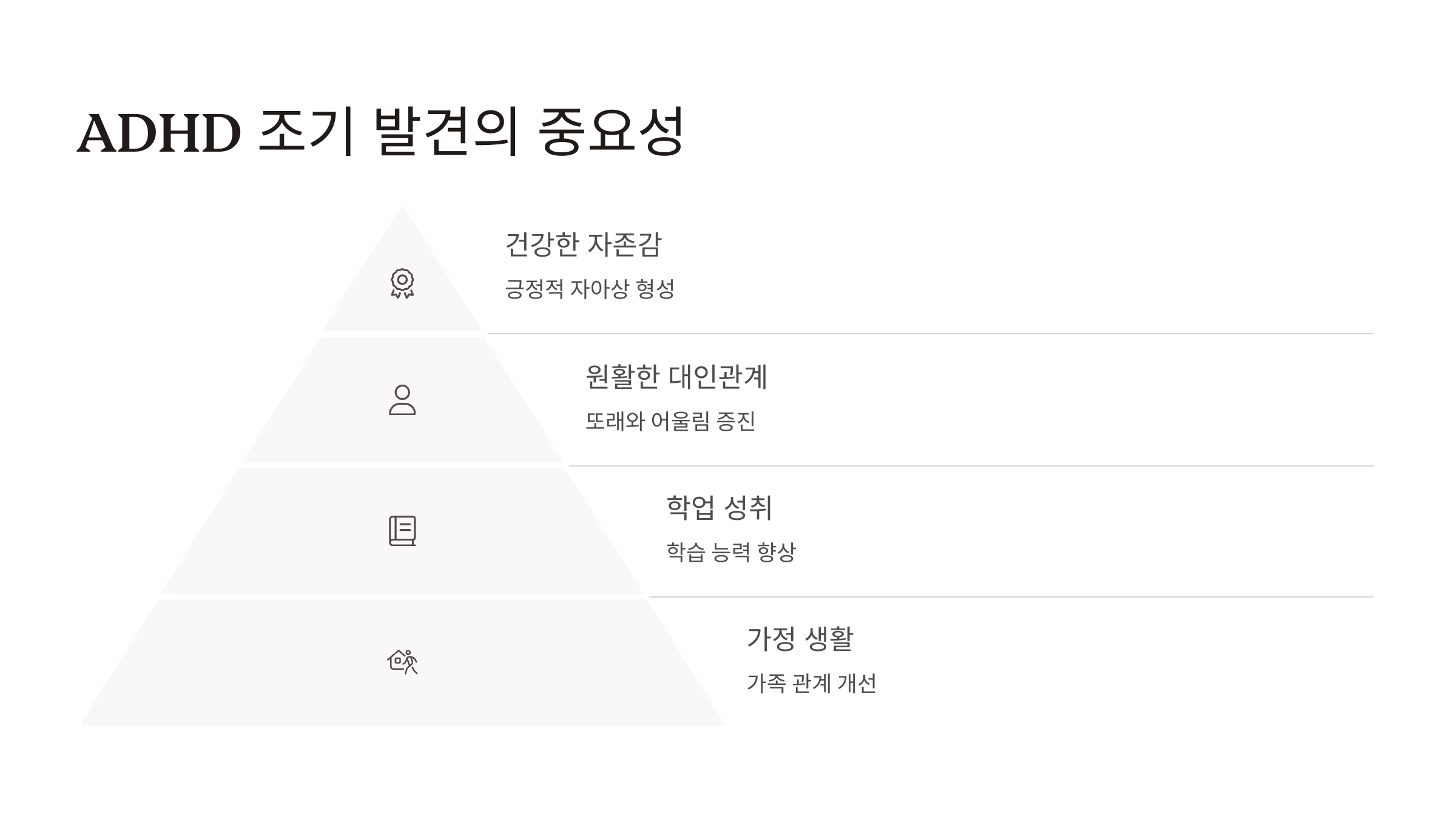 ADHD를 일찍 발견하는 것은 매우 중요합니다. 발견이 늦어질수록 아이는 수업에서 방해꾼이 되거나 대인관계가 어려워 다른 아이들과 어울리기 힘들어질 수 있으며, 이는 따돌림의 원인이 될 수도 있습니다. 또한 학업 성취도 어려워질 수 있습니다.