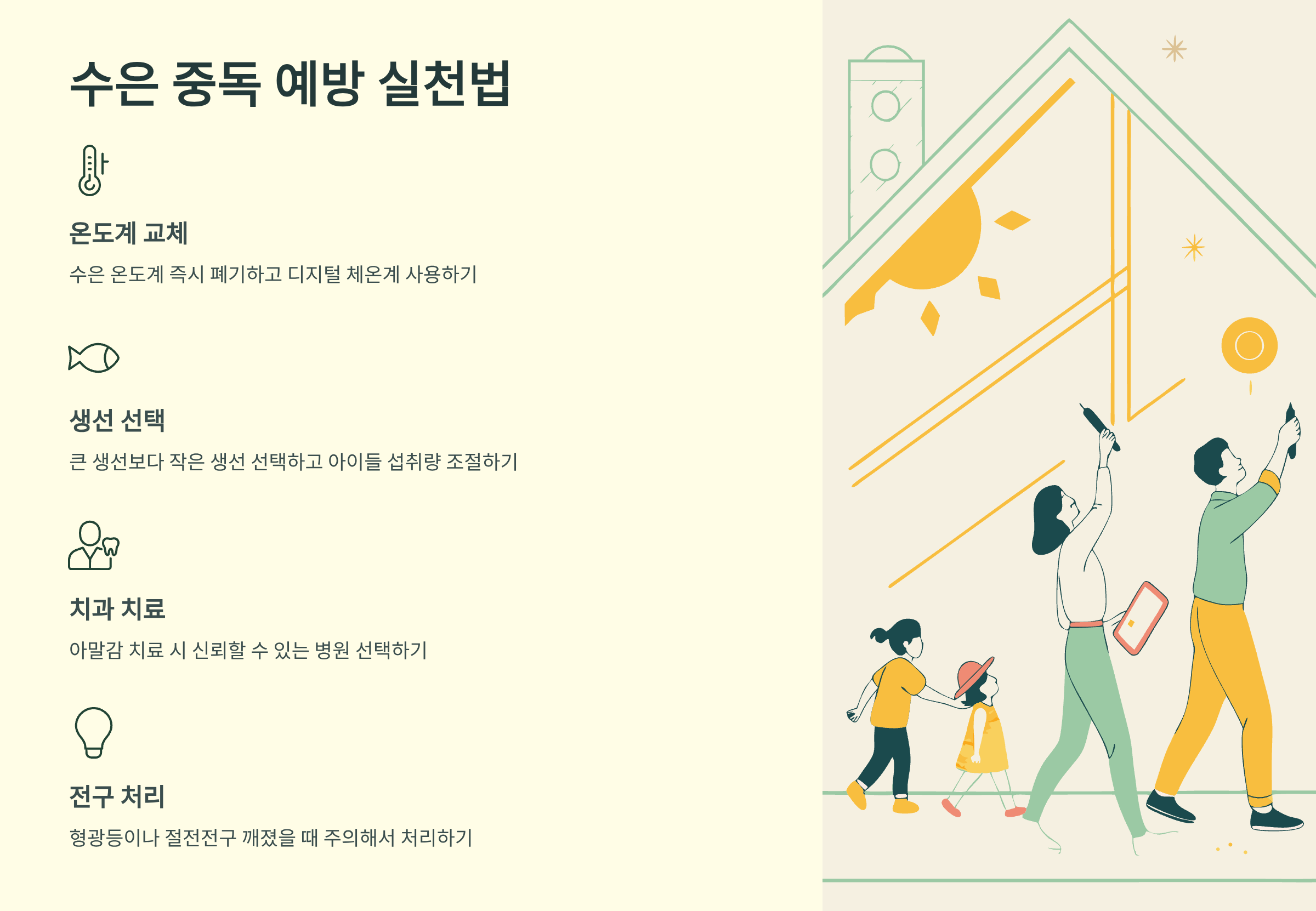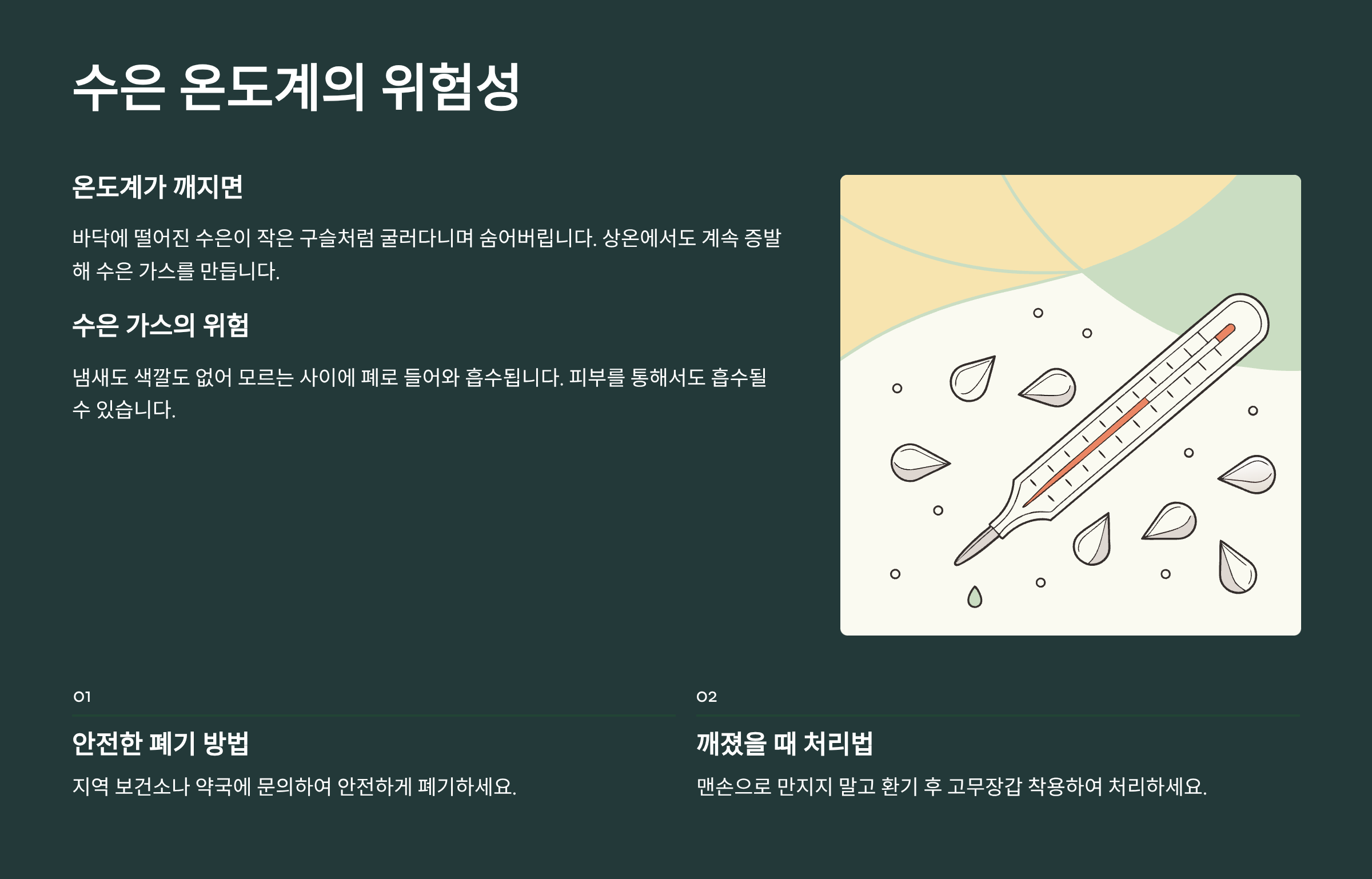 가장 중요한 건 집에 있는 수은 온도계부터 치우는 거예요. 요즘은 더 정확하고 안전한 디지털 체온계가 많으니까 굳이 위험을 감수할 필요가 없잖아요.