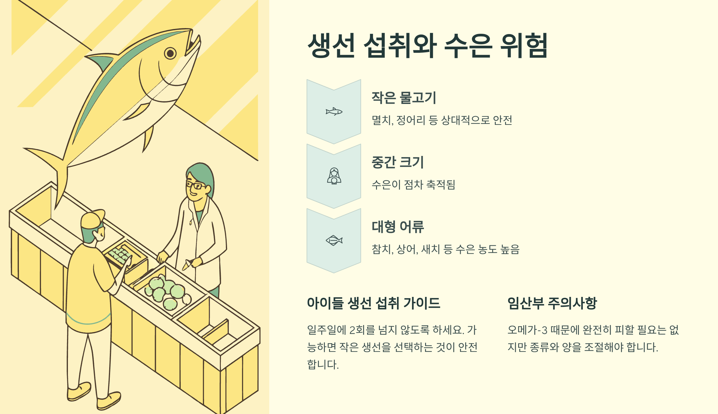 그래서 참치, 상어, 새치 같은 대형 어류에는 수은 농도가 높을 수 있어요. 반대로 멸치, 정어리 같은 작은 생선은 상대적으로 안전한 편이죠.