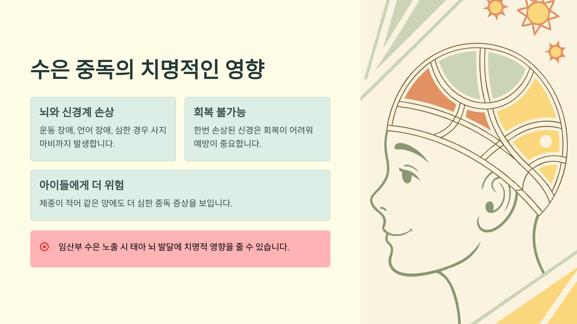 특히 우리 아이들에게는 수은이 더욱 위험해요. 아이들은 체중이 적어서 같은 양의 수은에 노출되어도 어른보다 훨씬 심한 중독 증상을 보이거든요. 게다가 아직 발달 중인 신경계는 수은에 더 민감하게 반응해요.