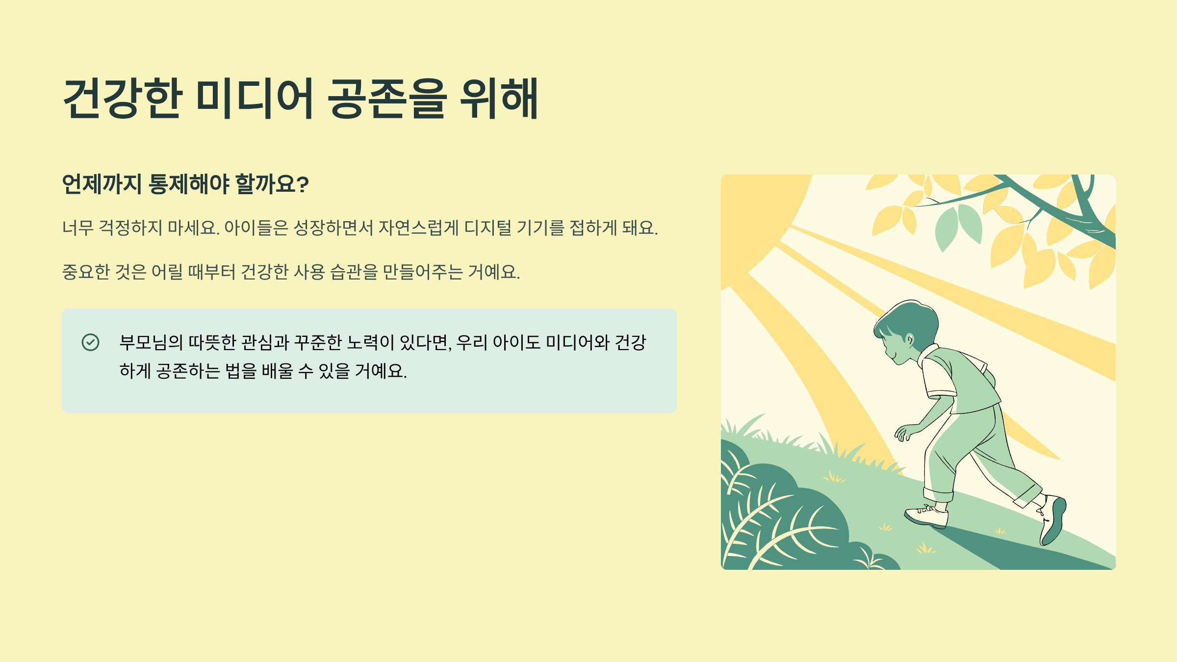 부모님의 따뜻한 관심과 꾸준한 노력이 있다면, 우리 아이도 미디어와 건강하게 공존하는 법을 배울 수 있을 거예요.