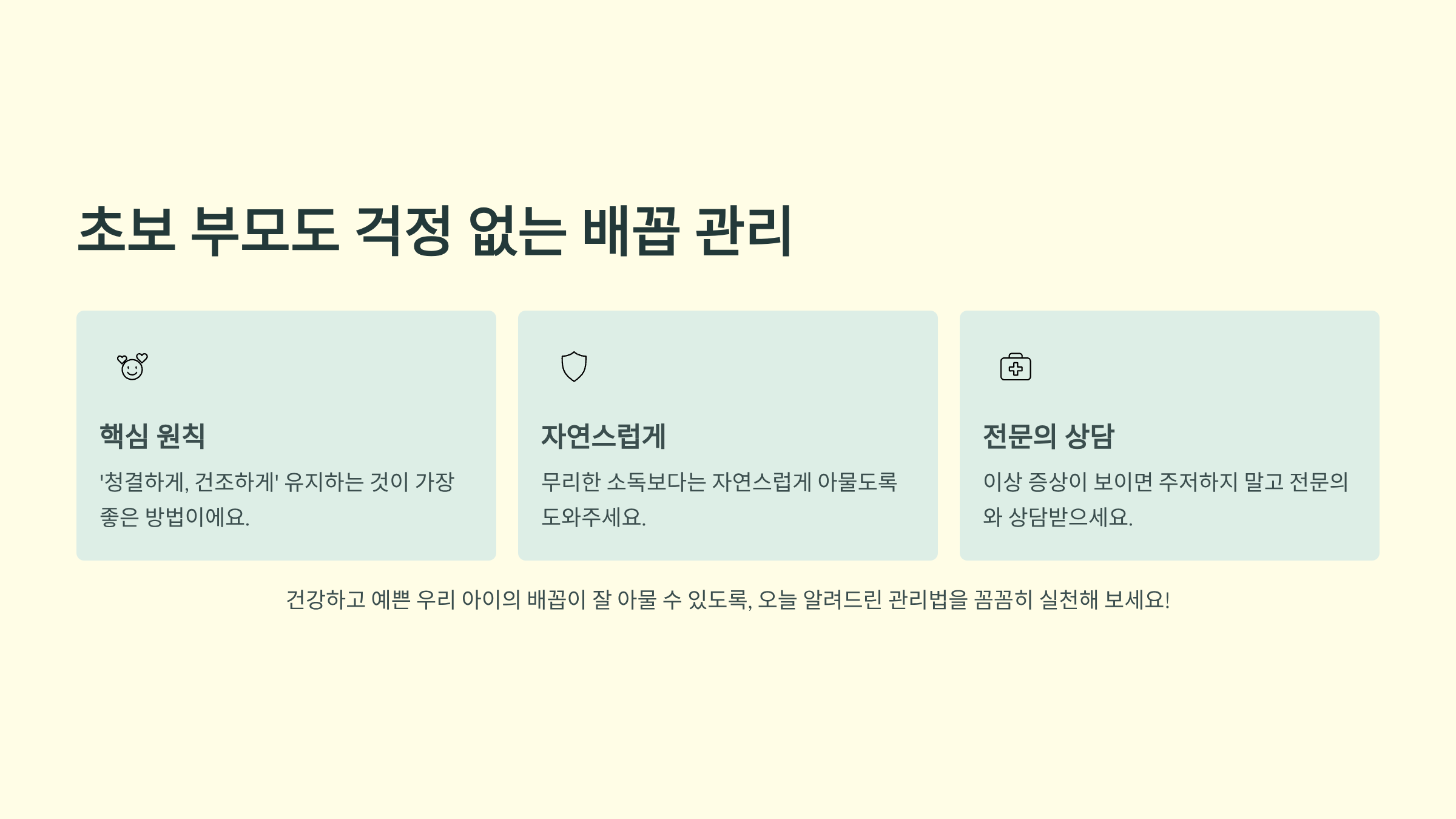 건강하고 예쁜 우리 아이의 배꼽이 잘 아물 수 있도록, 오늘 알려드린 관리법을 꼼꼼히 실천해 보세요. 분명 좋은 결과가 있을 거예요!