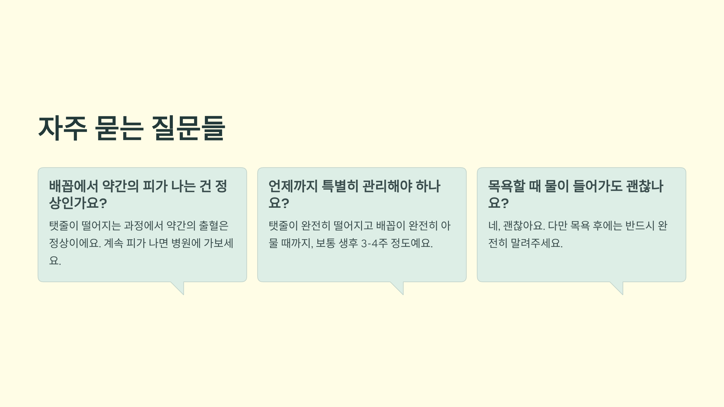 Q: 배꼽에서 약간의 피가 나는 건 정상인가요? A: 탯줄이 떨어지는 과정에서 약간의 출혈은 정상이에요. 하지만 계속 피가 나거나 양이 많다면 병원에 가보세요.