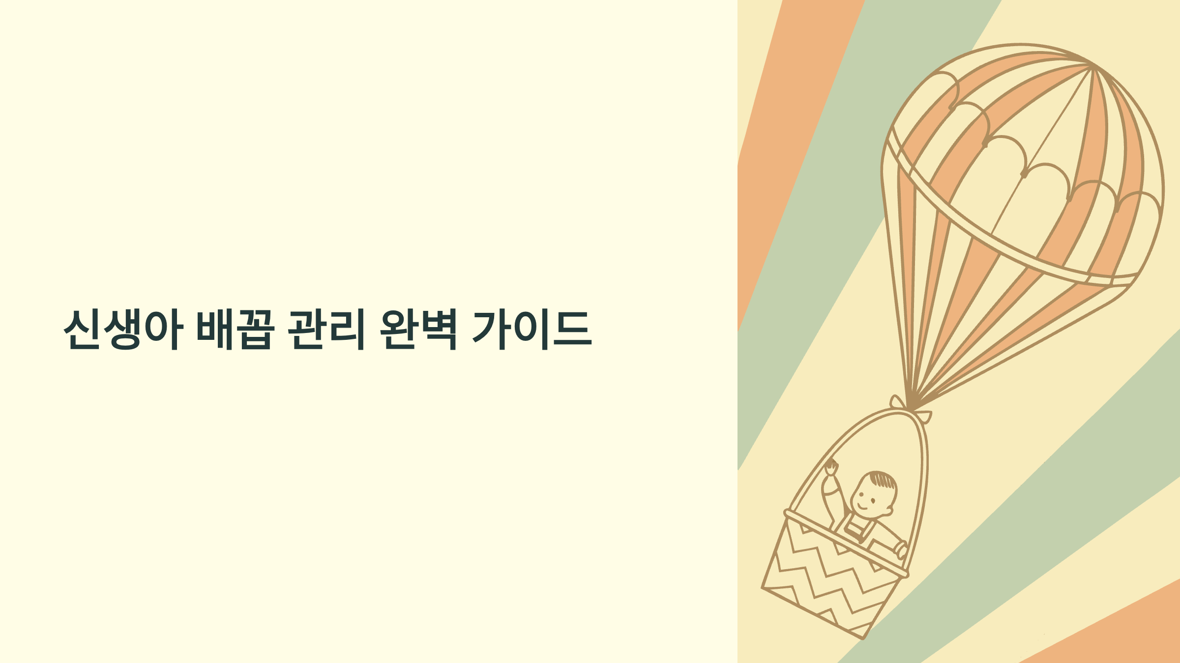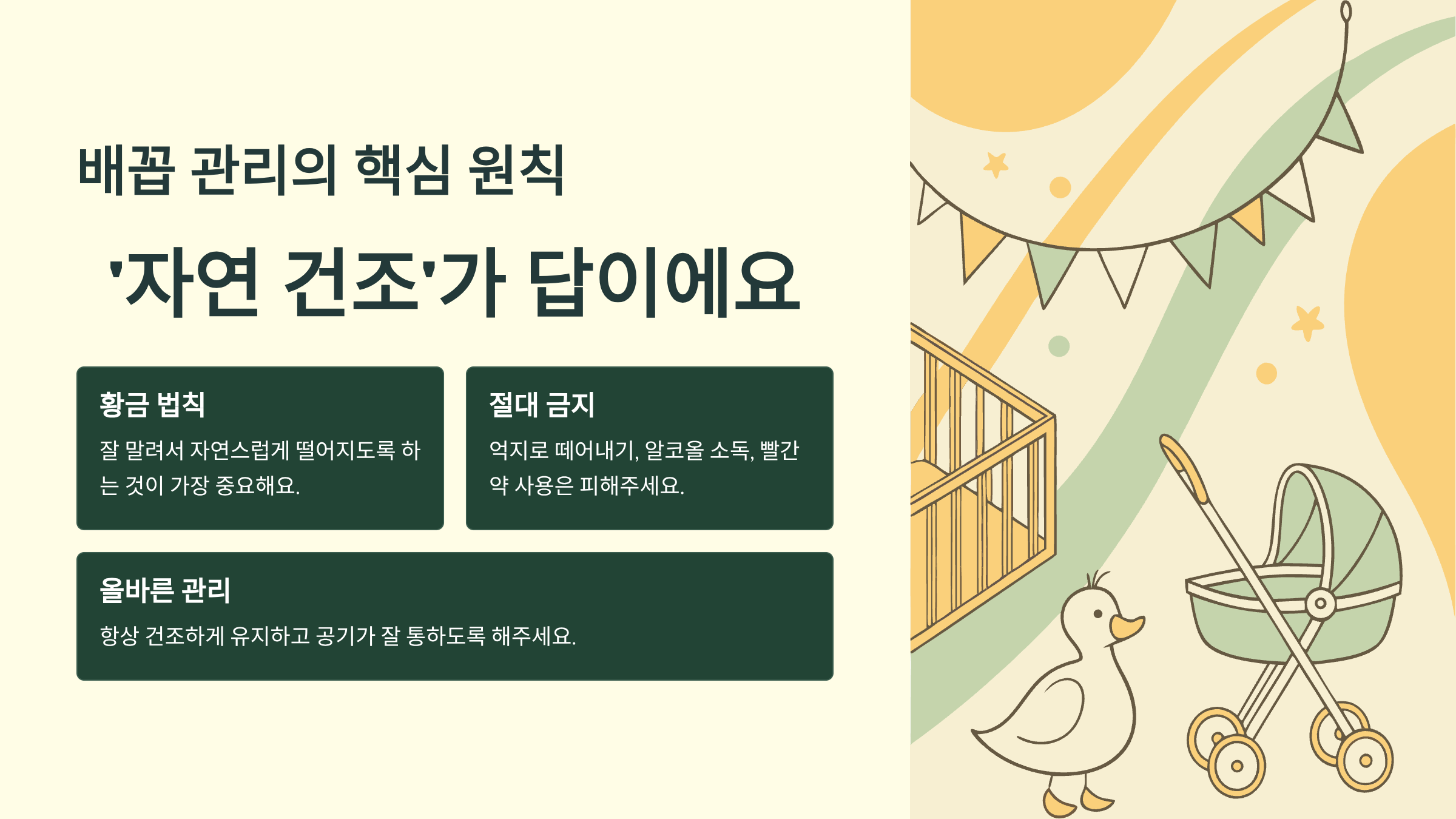 신생아 배꼽 관리에서 가장 중요한 것은 **'잘 말려서 자연스럽게 떨어지도록 하는 것'**이에요. 복잡한 소독이나 특별한 처치는 필요하지 않답니다.