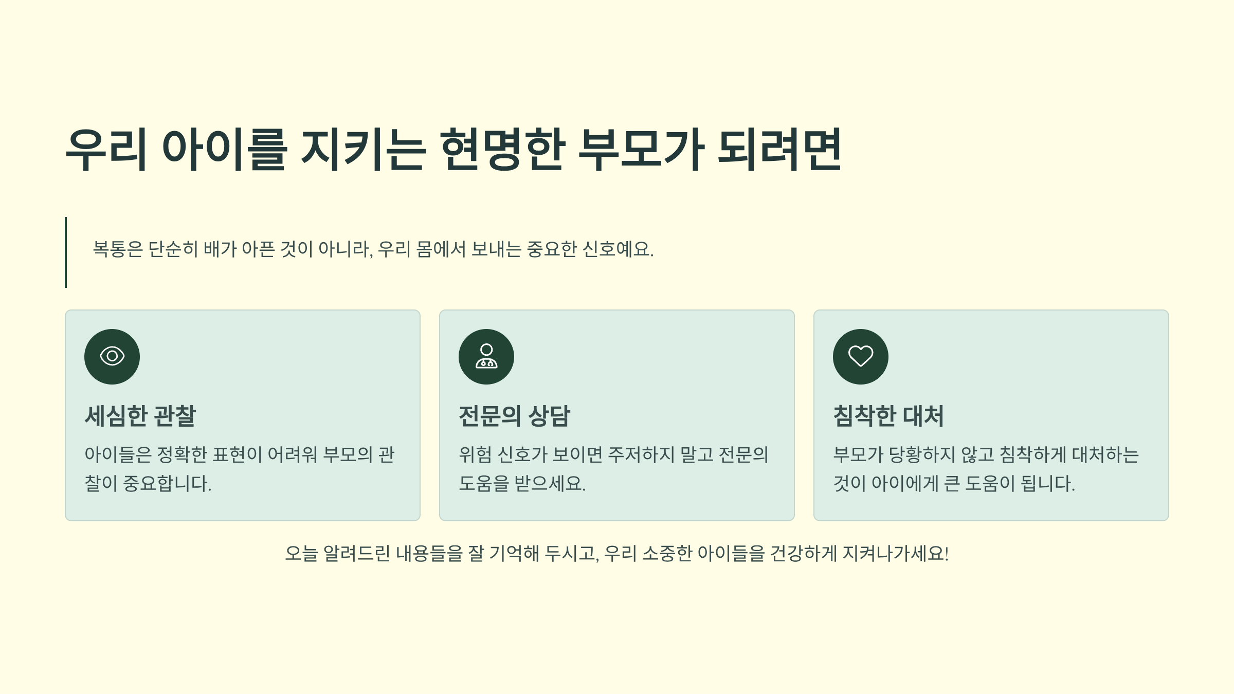 복통은 단순히 배가 아픈 것이 아니라, 우리 몸에서 보내는 중요한 신호예요. 특히 아이들은 어른처럼 정확하게 증상을 표현하기 어렵기 때문에 부모의 세심한 관찰이 정말 중요하답니다.