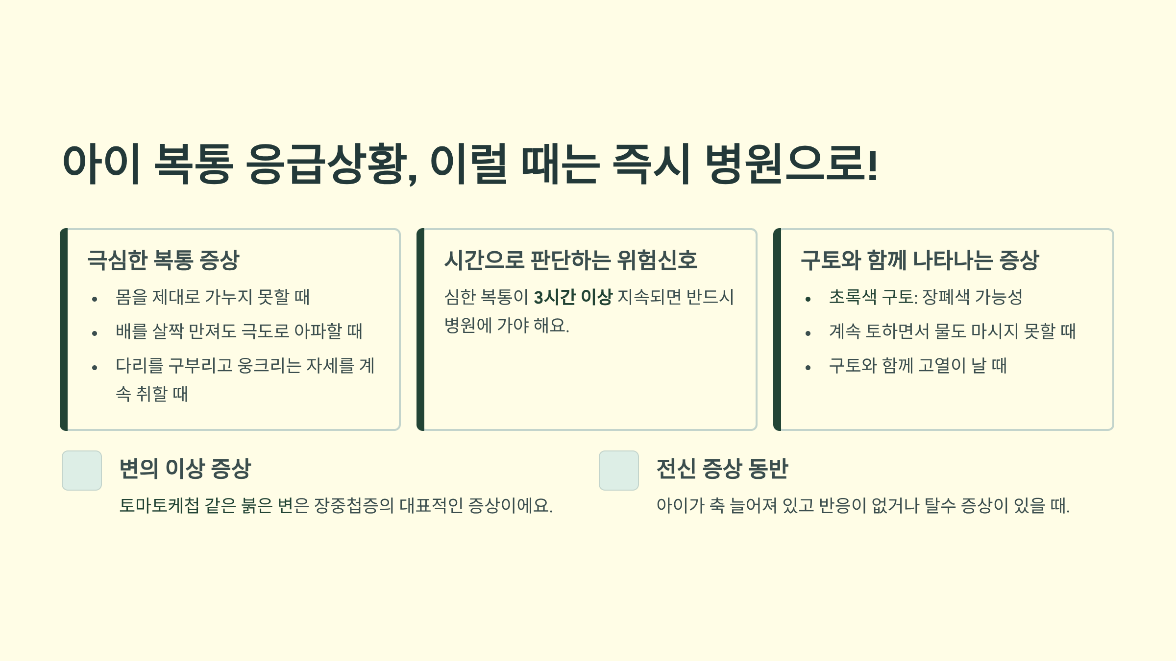 아이가 배 아프다고 할 때 다음과 같은 증상이 나타난다면 지체하지 말고 바로 응급실로 가야 해요.
