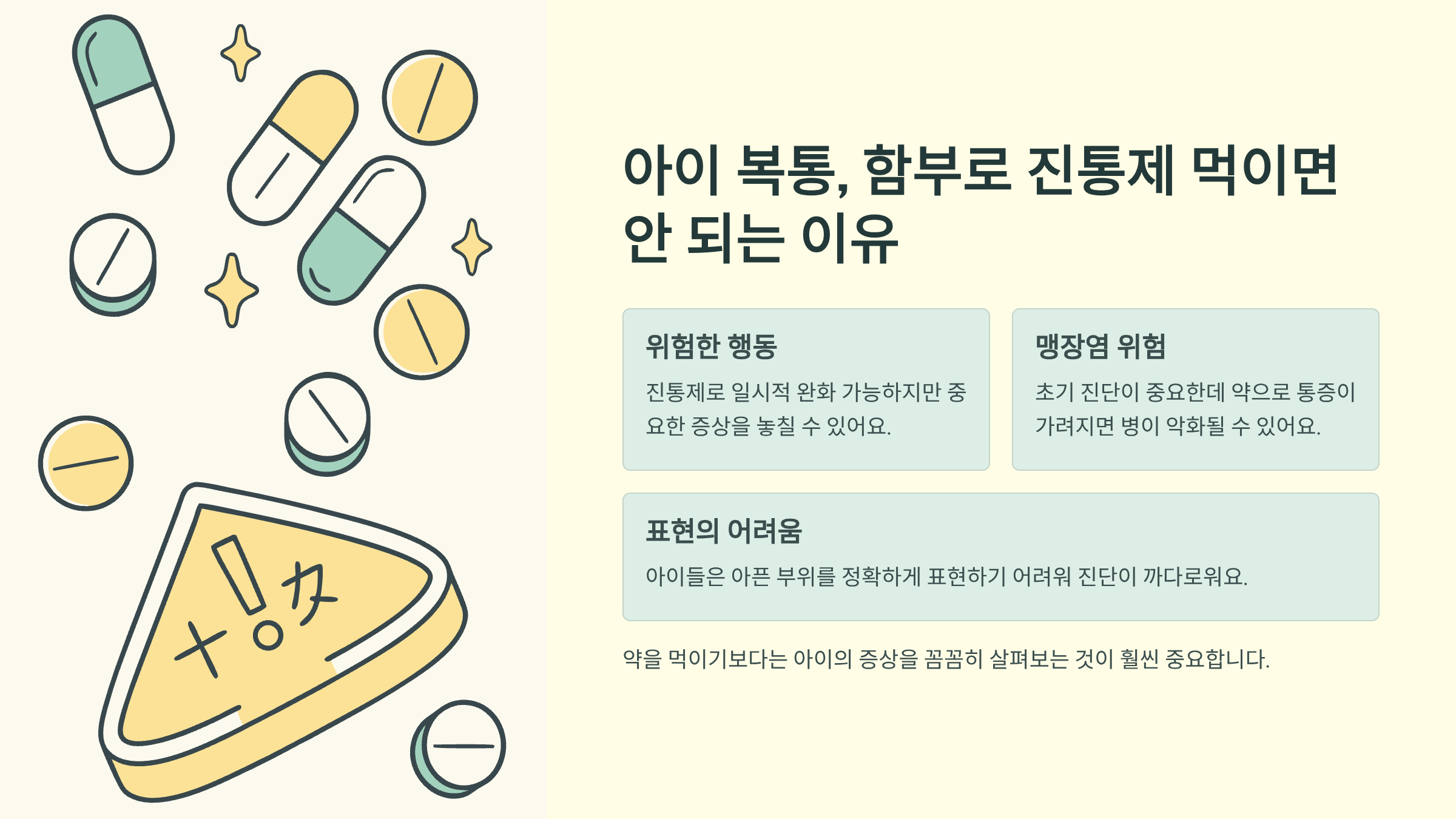 복통약이나 진통제를 먹이면 일시적으로 통증이 줄어들 수는 있지만, 이때문에 정작 중요한 증상을 놓칠 수 있거든요. 특히 맹장염(충수염)같은 경우에는 초기 진단이 정말 중요한데, 약으로 인해 통증이 가려지면 병이 더 악화될 수 있어요.