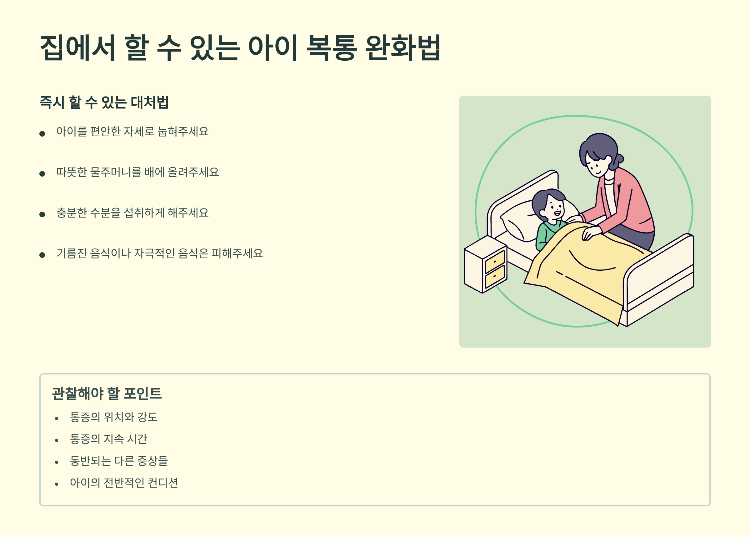 응급상황이 아닌 가벼운 복통이라면 집에서 이렇게 도와줄 수 있어요:
