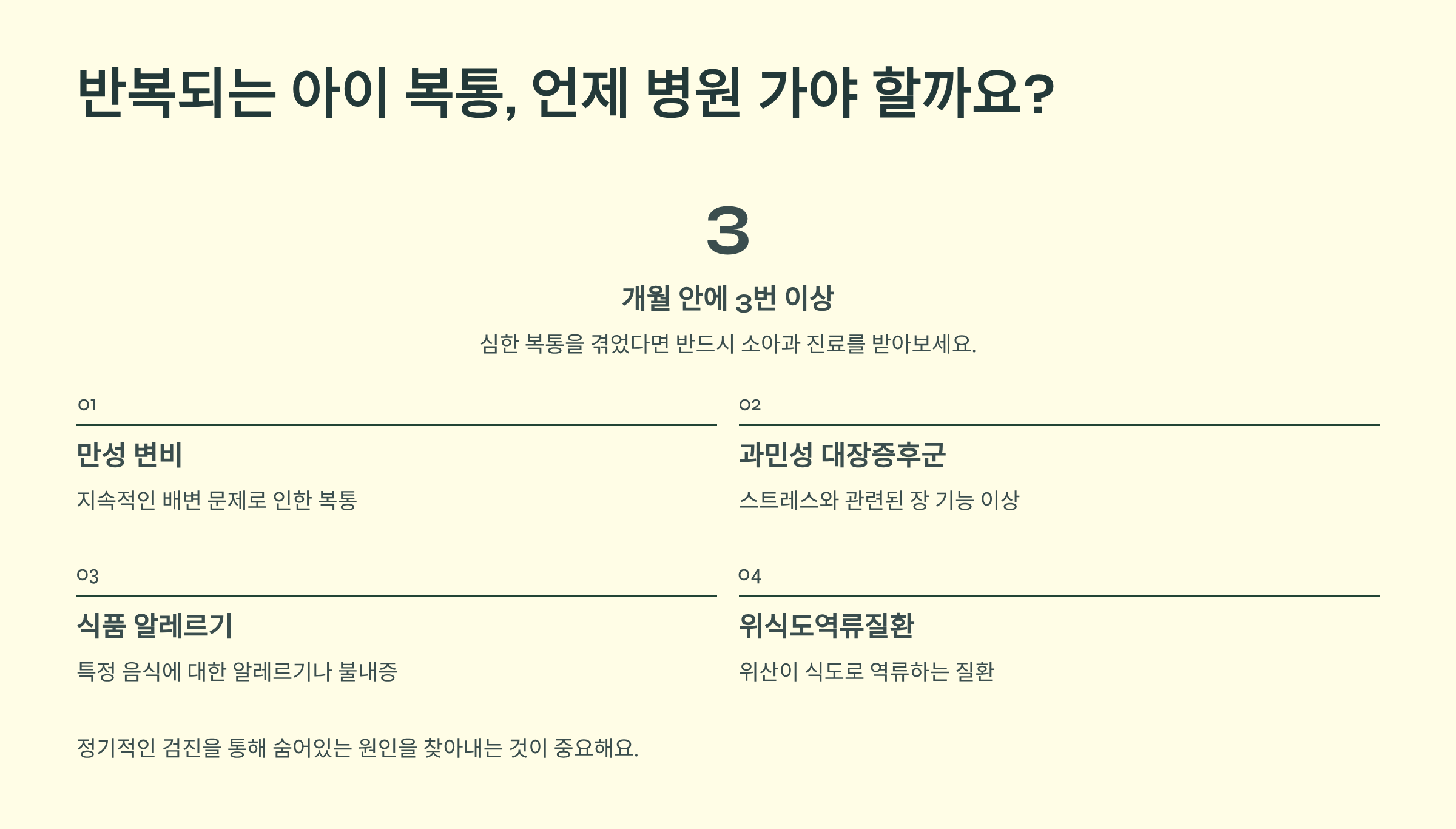 최근 3개월 안에 3번 이상 심한 복통을 겪었다면 반드시 소아과 진료를 받아보세요. 이런 경우에는 다음과 같은 원인들을 확인해볼 필요가 있어요: