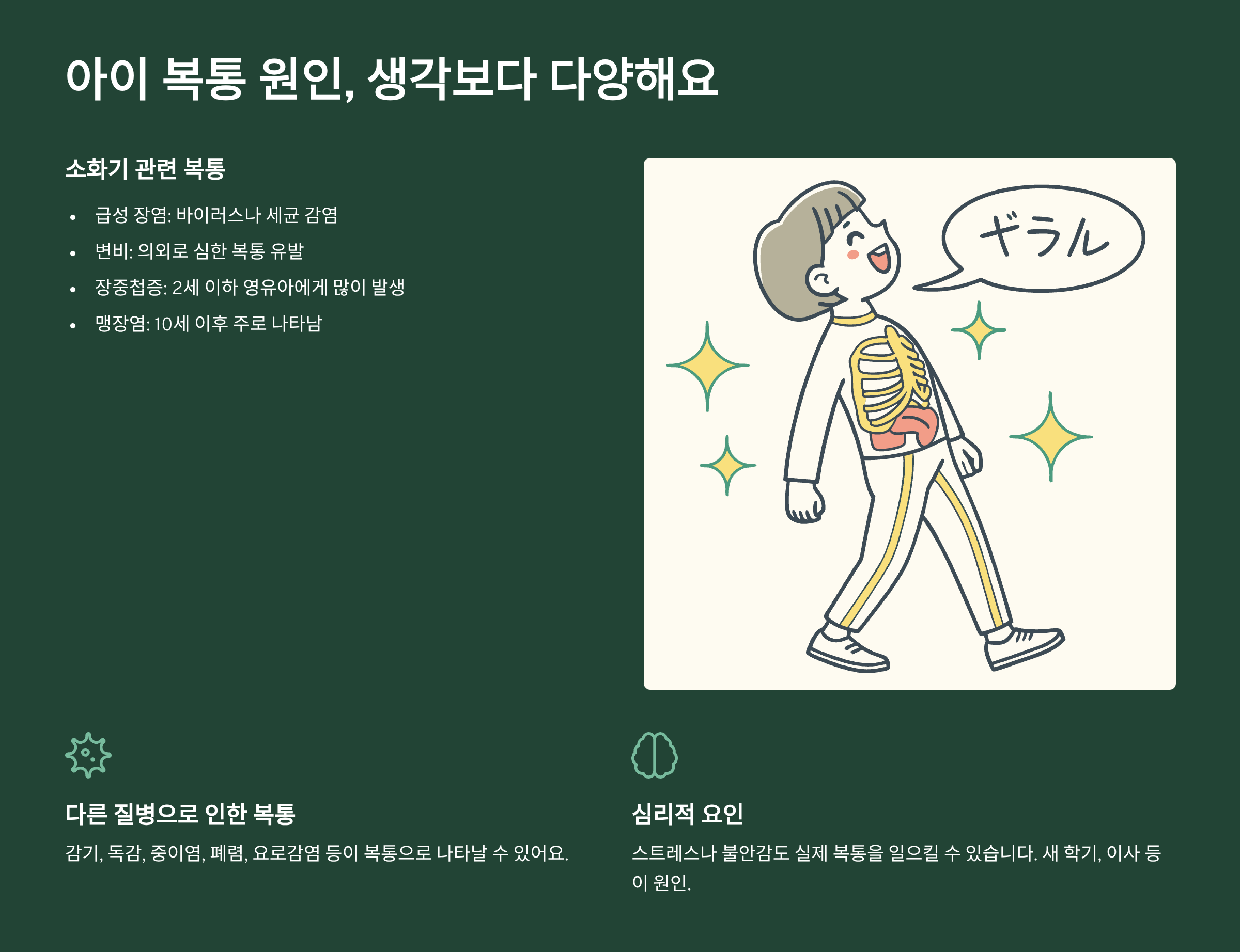 아이들의 복통 원인은 정말 다양해요. 단순히 배만의 문제가 아닐 수도 있거든요.
