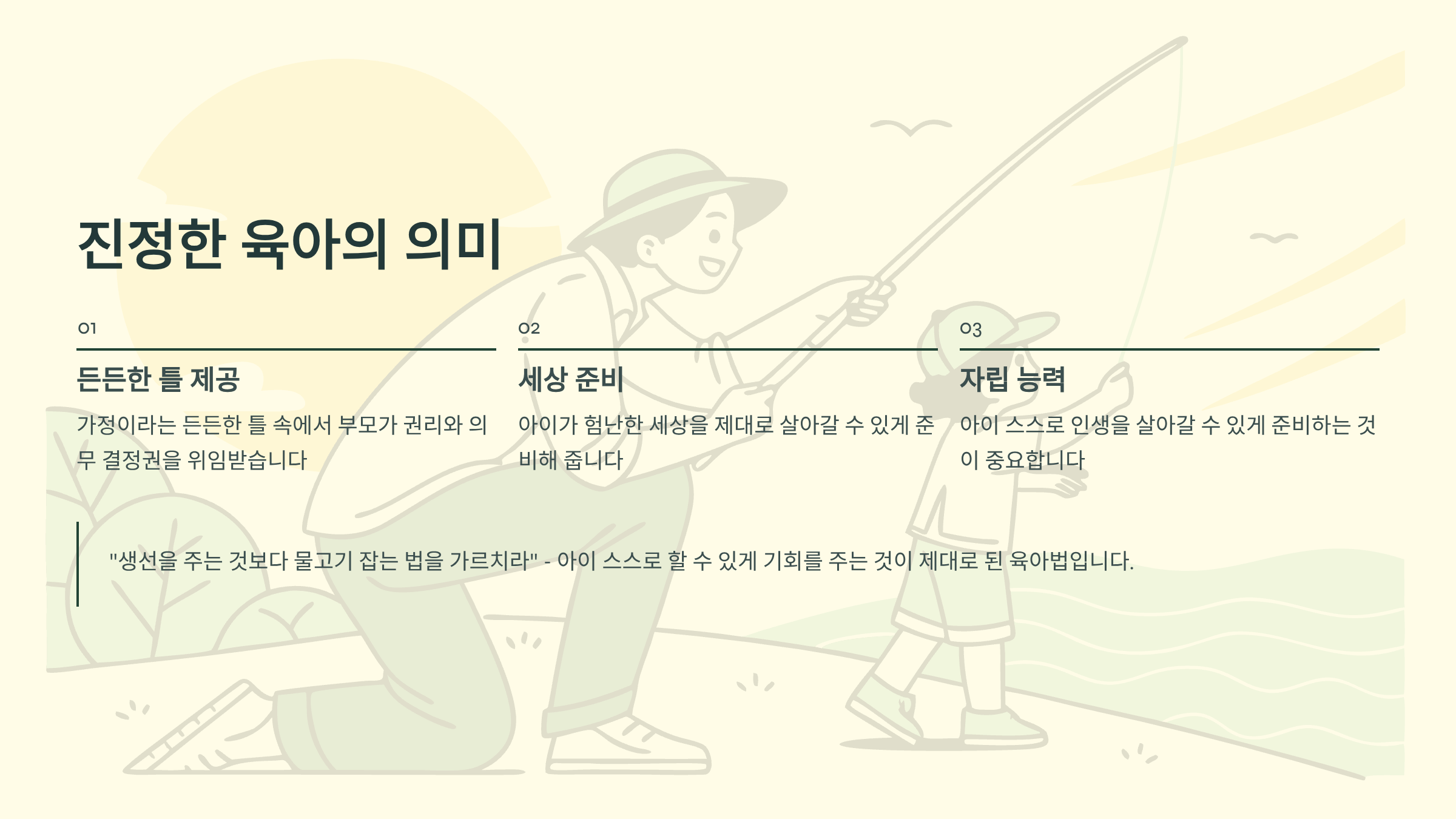 평생 부모가 아이 할 일을 대신 해줄 순 없기 때문에, 아이 스스로 인생을 살아갈 수 있게 준비해 두는 것이 중요하다는 이야기예요.