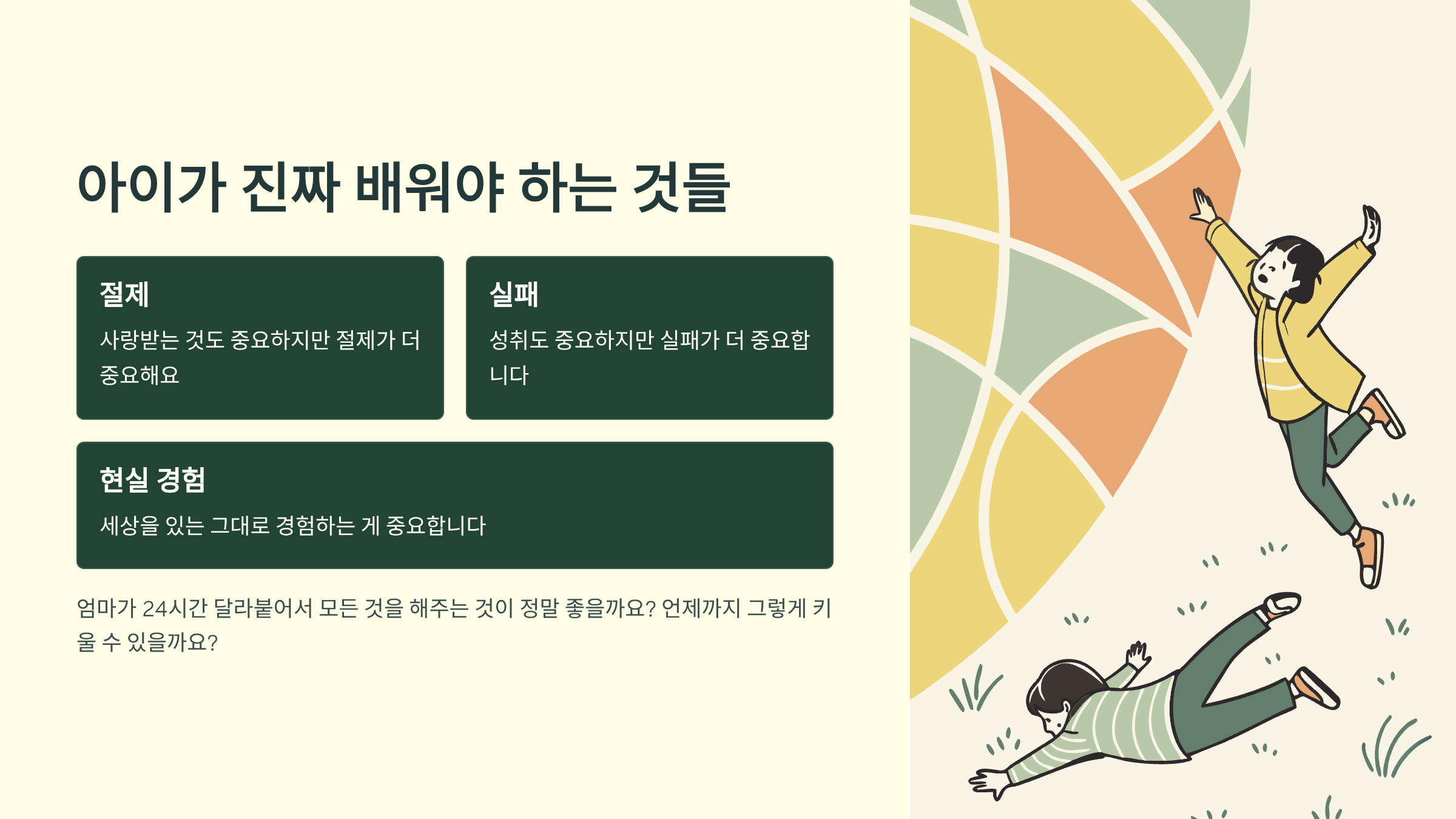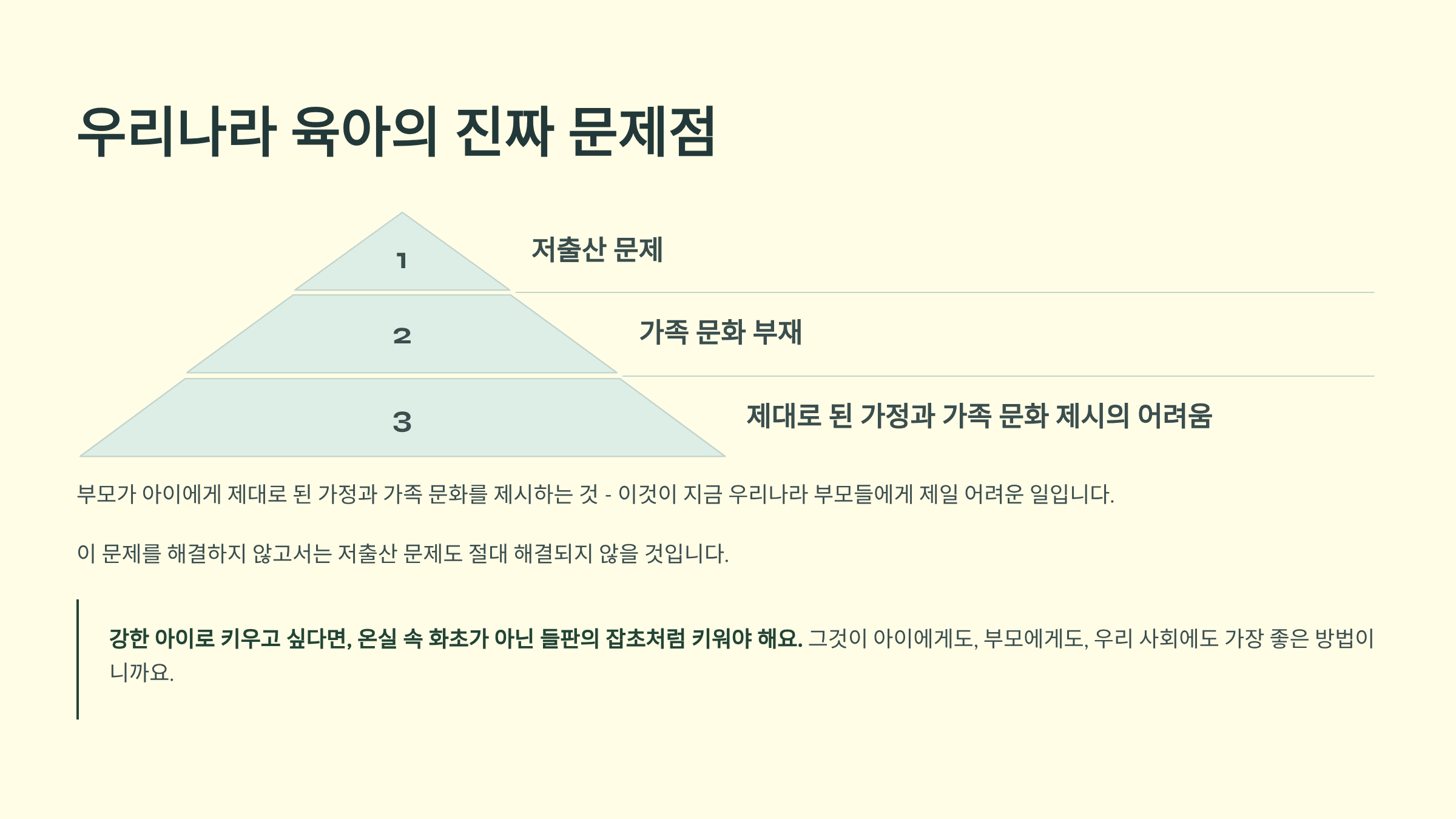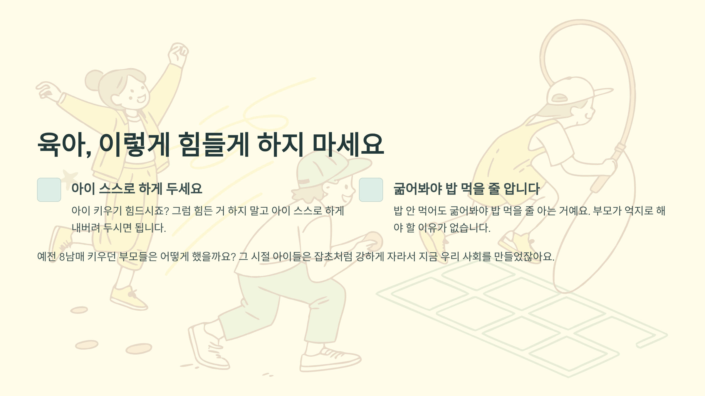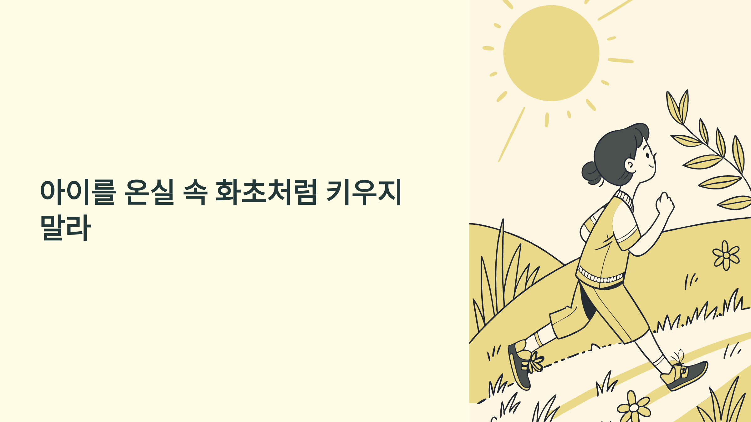 강한 아이로 키우고 싶다면, 온실 속 화초가 아닌 들판의 잡초처럼 키워야 해요. 그것이 아이에게도, 부모에게도, 그리고 우리 사회에도 가장 좋은 방법이니까요.